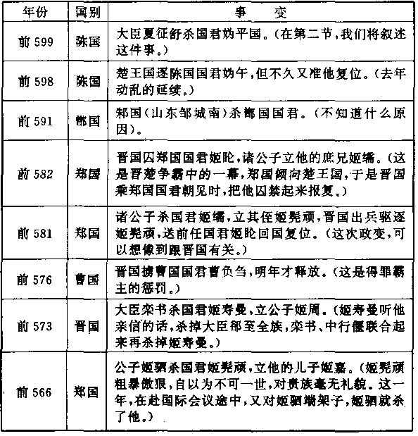 在国君们被逐被杀的浪潮中,最有趣的是周王国的国王,这个已经沦落为蕞尔的小国,它连自己的问题都无力解决,完全依仗霸主的脸色。上世纪(前七)姜小白“尊王攘夷”时代已经过去,现在,再没有人想到尊王这回事,“王”反过来还要尊霸主。而霸主对国际上的侵略行为和封国内部的政变,也丧失阻吓的力量,事实上霸主自己还在那里制造事端。霸权只是超级强国维护自己利益的工具,不再含有初起时那种以保护弱者自居的骑士的意义。 楚王国知道,要想恢复上世纪(前七)六十年代“城淄之役”丧失的霸权,必须再通过一次战争。 本世纪(前八)纪元前五九七年,楚王囗侣向晋国的尾巴国郑国进攻。合围之后,猛攻十七昼夜。郑国仗恃着晋国支持,拒绝投降。城角一处被攻破,囗侣正要下令攀登时,听到城中哭声震天,心里忽然不忍,反而下令撤退。可是郑国却误以为晋国援军已到,立即堵住缺口,男男女女蜂涌到城上继续作战。楚兵团看和平方法不能解决,再度进攻,郑国终于陷落。 囗侣并没有把郑国并吞,因为并吞后就直接跟晋国接壤,不如留一个小国作为缓冲。他取得郑国城下之盟后,即行退出。而此时晋军才缓缓赶到,楚兵团回军迎战。两国在必阝城(河南荥阳北)决战,晋军像山崩一样的溃败。兵士们狼狈奔窜,跳进黄河,向北游泳逃命。在激流中他们争着攀住本国的船舷或抓住船桨,刹那间三十几艘战舰被攀沉没。晋军总司令荀林父下令:“凡攀船抓桨的,砍断他的手指。”一霎时血淋淋的手指堕满各船,船上兵士一掬一掬的把它们抛进黄河。 必阝城之役使楚王国的霸权确定,晋国的霸权中落。距城濮之役三十六年。晋国的尾巴国纷纷转到楚王国的屁股之后,只有宋国、卫国、曹国、鲁国还没有变,但卫鲁二国不久就暗中向楚王国飞媚眼。 楚王国下一个目标是宋国。两年后(前五九五年),王子囗侧率领楚兵团发动攻击。宋国向北方的旧霸主求救,晋国刚刚战败,没有力量出兵。宋国首府睢阳(河南商丘)被围九个月,城里粮袜吃光,人民大批饿死,作父母的含着眼泪互相交换子女烹食,陷落在即。宋国宰相华元用一种只有春秋时代才行得通的办法来解决这个危机。一天晚上,他化装成楚王国的兵土,缒城而下,一直混进囗侧的寝帐(由此可看出楚兵团戒备的松懈和囗侧的低能),就在床头把匕首逼到囗侧的咽喉上,要求楚兵团撤退。华元表示,宋国可以投降,但必须楚兵团先行撤退十五公里,使宋国在外表上看起来不像是投降的样子。囗侧答应了,宋国也纳入楚王国阵营。 楚王国的霸权达到极峰,然而也就在这时候,一把刀子已暗中在它背后举起。这渊源于一个比三流作家笔下的言情小说还要荒唐离谱的男女恋爱故事,但它是事实。开始于本世纪(前六)初,而发作于本世纪九十年代。 女主角陈国大臣夏御叔的妻子夏姬,是郑国国君姬兰的女儿,生子夏征舒之后,丈夫逝世。夏姬是一位绝色美女,从她的沧桑经历和因她引起的国际战争,我们可以肯定,她一定是世界上最最具有魅力的女子之一。她首先跟陈国大臣孔宁、仪行父私通,经过二人的介绍,陈国国君妫平国也加入情夫的行列。最糟的是,他们还戏谑夏征舒像他们的共同儿子。纪元前五九九年(必阝城之役前两年),夏征舒杀掉妫平国。孔宁、仪行父逃到楚王国向霸主告状,楚王囗侣听了一面之词,而且逢上他正要展示他的霸权,而声讨“乱臣贼子”恰是一个理想的发动战争的堂皇理由。于是他灭掉陈国,把夏征舒处决。 夏姬的美貌使囗侣动心,就要自己带回皇宫。但大臣巫臣向他提出警告:“大王仗义兴兵,全世界谁不尊敬。如今却把祸首收做妃子,人们就会抨击你贪色好淫,恐怕对霸权有不利的影响。”囗侣认为他的话有很深的道理,大为佩服。王子囗侧(就是那位攻宋国时被敌人混到寝帐的总司令)请求把夏姬送给他,巫臣说:“这女子是不祥之物,为了她,已死了一个国君,灭亡了一个国家。如果娶她,一定后悔不迭。”囗侣说:“果然是不祥之物,少惹她为妙。”囗侧大怒说:“我不要她可以,但巫臣也不能要。”巫臣用一种委屈万状的声调说:“这是什么话,我怎么会有这种邪恶的念头,我只是一心为我们的国家。”恰巧另一位大臣连尹襄老的妻子逝世,囗侣就把夏姬送给连尹襄老,而夏姬不久就跟连尹襄老前妻的儿子私通。 两年后(前五九七),必阝城之役中,连尹襄老阵亡。夏姬跟嫡子私通的丑闻渐渐传开,在首都郢都(湖北江陵)住不下去,要求返回她的娘家郑国。巫臣早已派人通知郑国国君姬坚迎接他的姐姐,姬坚自然听从霸主国的命令。纪元前五八九年,晋国与齐国去鞍邑(山东济南)会战,齐国大败,向楚王国寻求同盟。囗侣派人去齐国缔约,巫臣自告奋勇前往。纪元前五八四年,巫臣出发,却在经过郑国的时候,宣称奉了楚王的命令前来跟夏姬结婚。然后他连齐国也不去了,缔约的事更抛到脑后,他知道不能再回到楚王国,就带着夏姬,双双投奔晋国。巫臣是楚王国有名的智囊人物,以富于谋略闻名国际。晋国大喜过望,把他当作上宾招待。巫臣为了夏姬,千方百计,辗转曲折,总算达到目的。 ——我们假设夏姬第一次结婚时十六岁,儿子夏征舒十六岁时杀死妫平国。那么纪元前五九九年,她已三十二岁。到纪元前五八四年跟巫臣结婚时,至少已四十八岁。真是不平凡的女性,不仅仅驻颜有术而已。可惜处在那个时代,她只能被她所不能控制