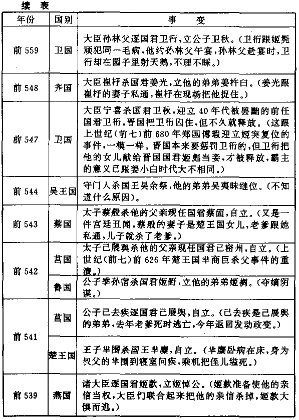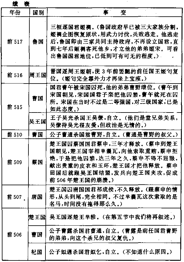 鲁国第十五任国君姬允(死于齐国姜诸儿之手的那一位),有四个儿子,长子姬同是嫡子,继承国君的宝座。次子、三子、四子,都是庶子,只能担任政府的高级官员。姬允被尊称为桓公,即威武的国君,所以他的三位庶子,被称为“三桓”。三桓的后裔,分别改姓(封国内全体贵族和全体官员,都是国君的后裔,跟国君同姓。所以庶子的后裔必须改姓,否则熙熙攘攘,挤来挤去,全国只有一个姓,分辨起来就很困难)。次子姬庆父的后裔改姓仲孙(有时候也称孟孙或孟),三子姬牙的后裔改姓叔孙,四子姬友的后裔改姓季孙。 本世纪(前六)初,仲孙蔑(仲孙觉的父亲)当宰相,他引进叔孙和季孙两家,由三大家族轮流掌握政权,世代相传,遂开始鲁国著名的达四百年之久的三桓政治。三桓从国君手中夺取到政权和广大土地的所有权,并在自己的封地上建筑都城,即表上所称的三都。鲁国国君遂跟周王国的国王一样,被冷落在一旁。八十年代时,第二十六任国君姬衤周,曾发动一次军事攻击,讨伐三桓,结果被三大家族赶走,在国外流浪至死。 问题是,三桓虽然联合起来夺取了鲁国国君的权力,但三桓也各有他们自己的助手和干部,当时称为“家臣”,这些家臣的力量,也日形膨胀。其中最杰出的一位是季孙斯的家臣阳虎,他代表一种反对割据的力量,不但把季孙压下去,把其他二桓也压下去。阳虎在稍后出任鲁国的宰相,负责实际政治三年之久。他谦卑地延揽专家,曾亲自拜访过孔丘,邀请孔丘任职,但孔丘怀疑他政权的稳定性,没有接受。 本世纪(前六)最后第二年(前五○二年),季孙斯向阳虎反攻胜利,阳虎逃亡。三桓对孔丘拒绝跟阳虎合作这一点有深刻的印象,于是任命孔丘担任中都(山东汉上)县长(中都宰),开始孔丘的政治生涯。 纪元前五九七年(夏征舒杀陈国国君妫平国后第二年),后巴比伦王尼布甲尼撒攻耶路撒冷,犹太国王约雅敬出降。尼布甲尼撒立约雅敬的儿子约雅斤为王,不久又把约雅斤废掉,立约雅敬的弟弟西底家为王。 纪元前五九四年(必阝城之役后第三年),雅典执政官梭伦建立公民会议跟司法陪审制度。世界各国平民参政和陪审团设立,这是首创。是雅典人对人类文明最伟大的贡献之一。 纪元前五八八年(齐晋两国鞍城之役次年),犹太国王西底家背叛后巴比伦帝国,尼布甲尼撒围耶路撒冷。 纪元前五八六年(吴王国建国前一年),耶路撒冷陷落,尼布甲尼撒挖出西底家的双目,下令焚城,把犹太人全部掳到巴比伦当奴隶,犹太王国亡。 纪元前五五○年(齐国大臣崔杼杀国君姜光前二年),波斯帝国崛起,灭里海南岸米太帝国,兵力益强。 纪元前五四六年(第二次和平会议举行),吕底亚王国和波斯帝国,在提力亚会战,吕底亚王国大败。又在首都撒狄城外会战,吕底亚的战马看见波斯的军用骆驼,既怪又臭,惊骇狂奔,遂又大败。国王克里萨斯被掳,吕底亚王国亡。 纪元前五三九年(第三次和平会议后第二年),波斯居鲁士大帝攻陷巴比伦城,后巴比伦帝国亡。居鲁士定都苏萨,释放后巴比伦掳掠的犹太人返耶路撒冷,犹太人在巴比伦为奴四十八年。 纪元前五○九年(伍子胥鞭尸前三年),罗马王国改建为共和国,设立执政官和元老院。开始信史时代。 ------------------ 123456网文网123456ww.com |