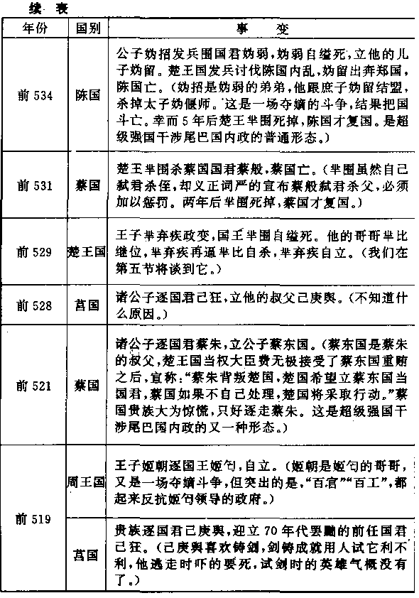 本世纪进入春秋时代后期,封国继续不断地被并吞,国君继续不断地被杀被逐。南方的楚王国跟北方的晋国,两大长期霸权,也继续不断地对抗,焦点集中在争夺位于中原的郑国、宋国,战争不息。 太多的战争促成两件大事,一是和平运动,一是晋国为了打击楚王国,在楚王国背上悄悄插上一把利刃——扶植吴王国兴起。和平的呼声反应人心趋向,吴王国的兴起促使楚王国的霸权终结。 本世纪(前六)被大国并吞的小国,有纪录的有下列的二十国,其中包括十二重要封国之一的许国。各灭亡之国能在临覆亡时留下名字,说明它们当时已具有相当规模。 一、楚王国并吞萧国(安徽萧县)、舒庸国(安徽舒城西南)、舒鸠国(安徽舒城舒鸠城)、赖国(湖北随州东北)、陈国(河南淮阳,不久复国)、蔡国(河南上蔡,不久于河南新蔡复国)、唐国(湖北随州西北)。 二、晋国并吞潞氏国(山西潞城)、倡阳国(山东枣庄西南)、鼓国(河北晋州)、肥国(河北藁城)。 三、莒国并吞曾阝国(山东苍山)。 四、齐国并吞莱国(山东平度)。 五、鲁国并吞寺阝国(山东济宁市东南)、专阝国(山东郯城)。 六、蔡国并吞沈国(安徽临泉)。 七、吴王国并吞徐国(江苏泗洪)、巢国(安徽巢湖)、钟吾国(江苏新沂)。 八、郑国并吞许国(河南鲁山)。 逐君杀君事件,跟上世纪(前七)一样的层出不穷: