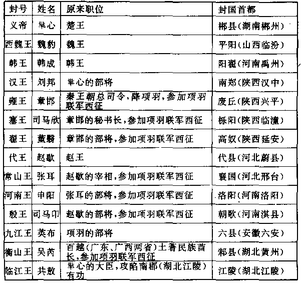 仔细研究这个表,就会发现项羽是一个毫无政治头脑的莽汉。他所建立的不是一个统一的国家,而是一个地位都互相平等的国际联盟,连邦联的资格都够不上。因为大家都是独立王国,在体制方面,项羽这个国王并不能高过别的国王。尤其是当我们注意上表那些新国王的原来职位,更会发现项羽处理这次分封,完全被他自己的喜怒和他左右那些三流角色的政客所操纵,所以自己为自己制造出来不必要的严重危机。像囗心,一个无权无势的小朝廷,项羽把他迁到一千公里外蛮荒的郴县(湖南郴州),囗心也顺服的听命之后,项羽仍不容他存在,派人把他杀掉。像刘邦,项羽应该依囗心的初约,封他当秦王,至少也要把他封到距家乡较近的地区,满足刘邦与刘邦部下的思乡心理,这对项羽并没有损失。但项羽仍记得刘邦比他先进入咸阳的大恨,而把刘邦驱逐到当时人们都认为是蛮荒的南郑(陕西汉中)。像齐王田市,非常热心的派遣他的大将田都率领军队参加项羽的联军西征,田都即令有功,正常的情形应该是由项羽对田都加以赏赐,遣送回国,由国王田市再予擢升。可是项羽却卖弄他的权威;把田都封为齐王,而把本来的齐王田市逐出国都临淄(山东淄博东),贬到偏僻的即墨(山东平度)当胶东王。对燕王国跟赵王国,也都如此。后来更把韩王韩成当作罪犯一样的捉住杀掉,致使韩成的智囊张良投奔刘邦,跟项羽作对到底。中国有句谚语说:“天下本来不乱,是低能的人把它搞乱的。”正是项羽的写照。 ——有一件事也可帮助我们对项羽的了解,当时一位学者蔡生,建议项羽建都咸阳(陕西咸阳),因为咸阳具有最适中的位置,可以统御全国。项羽拒绝采纳,他说:“富贵不回故乡,好像穿了漂亮的衣服在黑夜里走路。”项羽的目的只是在向他的乡人们炫耀他的富贵,所以坚持返回东方。蔡生告诉朋友说,“人们都说:项羽像一个穿人衣戴人帽的猴子,果然不错。”这话传到项羽耳朵,项羽就把蔡生投到巨锅中煮死。 西楚王国只缔造了两个月,战争就重新爆发。 旧齐王田市的宰相田荣,首先发兵迎击他的旧同僚新齐玉田都。旧赵王赵歇的宰相陈余,也发兵攻击他的老友新任常山王张耳。但项羽认为这些叛逆在自掘坟墓,他的强大兵力,可以贯彻他的任何荒谬政策。他先攻击田荣,准备消灭田荣后,挥军西上,再消灭陈余。田荣果然不堪一击,兵败身死,项羽纵兵大肆屠杀,人民为了保护自己的生命财产,不得不集结起来武装抵抗,叛乱随着项羽不断的军事胜利而更加扩大,西楚兵团陷于疲于奔命的泥沼。田荣的弟弟田横率领的新集结起来的齐兵团,开始跟项羽进行捉迷藏游击战。 远在西方万山丛中的汉王刘邦,抓住这个机会,悄悄从南郑(陕西汉中)出发,越过秦岭山脉,把故秦王国领土上项羽所建的一些封王,一鼓荡平。然后大军东征,并为那个可怜的牧羊人囗心发丧,号召全国共同讨伐项羽的弑君之罪。 纪元前二○五年四月,刘邦攻陷项羽的首都彭城(江苏徐州)。 项羽得到彭城陷落的消息,立即放弃田横,亲率三万人的精兵南下反攻。汉军大败,仅只被挤到谷水、泅水溺死的就有十余万人,溃退到灵壁(安徽濉溪)。西楚兵团的追兵赶到,汉军再大败,被挤到濉水溺死的又有十余万人。两次战役,说明项羽用兵的灵活和勇猛。 刘邦达到荥阳(河南荥阳),西楚兵团把荥阳团团围住,水泄不通。刘邦狼狈不堪,他的部将纪信伪装刘邦的模样,开东门出降。刘邦乘着楚军狂欢呼号万岁,因而戒备松懈之际,从西门悄悄逃走。刘邦自己虽然受到一连串的挫败,但他派出去的大将韩信却用兵如神,进入黄河以北之后,把黄河以北项羽所建的一些封王,如西魏玉、常山王、代王、燕王、殷王,以及使项羽疲于奔命的田横所辖的故齐王国地区,只几个月工夫,就把他们一一征服。 西汉王朝赖三个杰出的人物而建立,即大将韩信、智囊张良、后勤总司令萧何。韩信是故楚王国的一个穷苦的流浪汉,张良是故韩王国贵族的后裔,萧何是故秦王朝县政府的低级官员。假如不是时代动乱,他们只有淹没在人海之中。韩信曾当过项羽禁卫军的低级军官,为项羽当过卫兵,屡次向项羽献计献策,项羽都不能采纳。唯英雄才能识英雄,项羽只是一员勇敢的将领,不是政治家,所以他不能了解韩信,犹如小学生不能了解大学生的课程一样。项羽不但对韩信失之交臂,对他唯一的智囊,被尊称为“亚父”的范增,也不能容忍,终于把范增逐出政府。只有刘邦具备当时所有领袖们都没有的才能,他在黑社会中培养出来的高度智慧和宽宏度量,使三个杰出的人物为他效力,使他自己成为中国历史上第一位平民出身的伟大君主。 荥阳战役之后,战争成胶着状态、项羽不断的进攻,刘邦不断的失败。刘邦几乎是每战每败,但他像一头苍蝇一样,失败后兜了一个圈子,收拾残军,又转回来战斗。萧何的后勤工作是第一流的,他坐镇首都栎阳(陕西临潼),刘邦在前方从来不缺少粮食和兵源补充。而扫荡黄河以北的韩信,于占领了故齐王国地区后,开始抄掠项羽的后路。项羽不久就陷于求战不能,求胜更不能的苦境。 九十年代纪元前二○三年,项羽要求和解,只有和解才能救他。结果双方同意以鸿沟(赢政大帝开凿的运河)为界,瓜分世界,鸿沟以西归汉,鸿沟以东归西楚。 签约之后,项羽大大地舒了一口气,把所俘虏的刘邦的父亲送还给刘邦,率领大军东归,以为从此可以休息一段时间。然而,刘邦