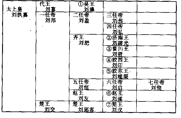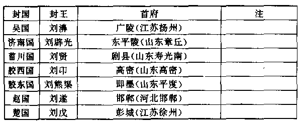 刘邦当了皇帝后,原则上皇族子弟封王,非皇族的功臣封侯。刘邦对封侯不太注意,但因“封王”拥有自己的政府和自己的军队,所以十分重视。他特地杀了一匹白马,厚着脸皮命大臣向天老爷盟誓:“不姓刘而当王的,天下人共同攻击他。”但刘邦死后不久,封国和中央政府之间,就开始了离心现象。战国时代苏秦、张仪的遗风仍在,知识分子和聪明才智之士,在中央政府不能施展抱负,往往投奔封国。封国既有实力,又有理论指导,欲望遂一天天提高,离心力逐日增加。 这种现象被很多人发现,其中之一就是刘启的宰相晁错。晁错极力主张把封国的面积缩小,把封王的权力减少。刘启赞成这种做法,但那些已经够大的封王,当然不愿意接受。所以在雷厉风行削小了三个封国之后,前一五四年,东方的七个封国,送联合叛变。这七个封国是: