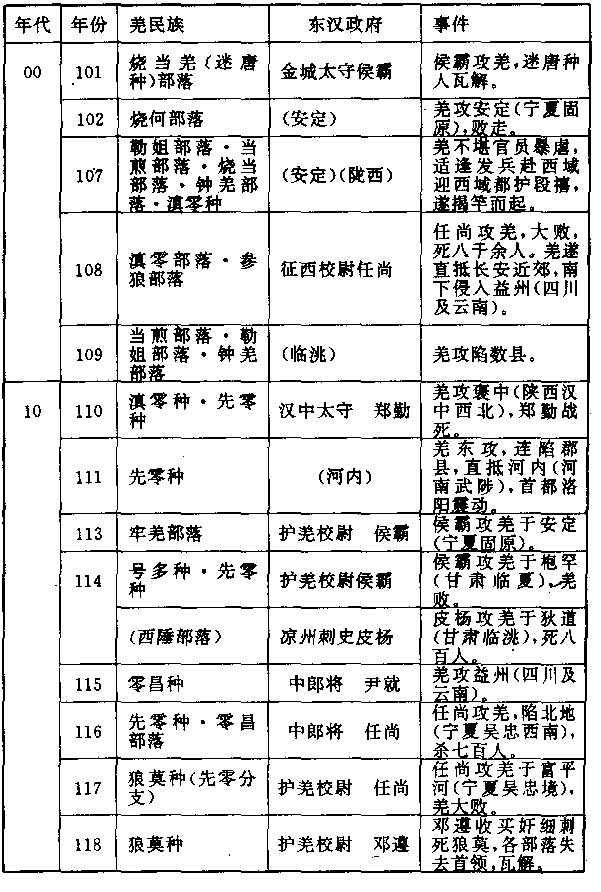 中国历史一向是环绕着一个圆圈盘旋:一、旧王朝统治阶级腐败灭亡。二、军阀或变民集团乘机夺取政权,发生混战,杀人如麻。三、混战的最后胜利者建立新的王朝,组织新的政府,成为新的统治阶级。四、经过一段安定或繁荣的时间。五、又回到第一:统治阶级腐败灭亡。——如此这般,像走马灯一样,循环不已。 本世纪的中国,正走上第一第二阶段。首先是外戚政治重现,接着招来中国第一次宦官时代。最后,东汉政府在一次农民大暴动后瓦解,大一统也瓦解,遍地战火。 西域(新疆)重返中国版图,是英雄豪杰们千辛万苦换取来的。本世纪(二)第三年(一○二),总督(都护)班超退休,返回洛阳。东汉政府派遣一位看起来十分聪明的将领任尚接替,任尚向班超请益说:“我初次担当这么大的责任,深感难以负荷。您在塞外三十年,请赐指教。”班超回答说:“塞外的中国官员,差不多在国内都犯过错误,才出塞立功求赎,并不都是小心谨慎、孝子贤孙型那种人。至于外国人士,更各有各的企图。很难使他们顺眼,却很容易激起他们的反抗。你的性情,十分严正。俗话说:‘太清澈的水没有大鱼,太严格的要求失去团结。’我的意思是,凡事应该求其简单,对小过错多加宽恕,分层负责,你只总揽大纲,不挑剔小节。” 班超跟张骞一样,不仅是成功的冒险家,更是成功的政治家。但智慧低一级数的人,永远不能领悟高一级数人的见解,犹如一头牛永远不能领悟交响乐。班超走后,任尚讥讽说:“我以为班超有什么了不起源来是个平凡人物。” 只四年时间,任尚就激起西域(新疆)所有国家的叛变。任尚的总督府继班超之后,设在疏勒王国(新疆喀什)。一○六年,各国联合向疏勒进攻,任尚不能阻挡,急向国内求救。东汉政府把他召回,另行派遣一位将领段禧继任总督。但混乱的局势已不可收拾,段禧转战到龟兹王国(新疆库车),不能再进。龟兹王是支持段禧的,但龟兹人民叛离他们的国王,与温宿王国(新疆乌什)、姑墨王国(新疆阿克苏)组织联军,攻击段禧和龟兹王。段禧把他们击败,不过整个西域只剩下龟兹一座孤城,前瞻十分黯淡。勉强支持到明年(一○七),东汉政府只得再撤销西域总督,撤回所有残留的屯垦区。 一一九年,敦煌(甘肃敦煌)太守曹宗试探着派遣部将索班再进入伊吾卢(新疆哈密)屯垦,鄯善王国(新疆若羌)和车师前王国(新疆吐鲁番),重又归附中国。不久,尚未向西移尽的北匈奴残余部落(新疆阿尔泰山南麓)跟车师后王国(新疆吉木萨尔)联合,攻陷伊吾卢,杀死索班。鄯善王国向中国求救,中国政府正困于日益严重的芜战,不能出兵。只派遣了班超的儿子班勇担任西域(新疆)参谋长(西域长史),进驻敦煌,遥作声援。北匈奴的残余部落和车师后王国乘这个机会,企图进攻已成为中国本土的河西走廊。身为英雄之子的班勇,忍无可忍,率领六千人反击,生擒车师后王国国王,带到索班死难处斩首,把头传送到一千九百里外的首都洛阳,悬挂示众。然后征调各国军队,进攻北匈奴的残余部落,北匈奴大败,向北逃走,从此再没有出现。 然而,中国也没有再派总督,只继续派参谋长代理。班勇的后任,没有一个是适当的人选。这是统治阶级长期腐败后必然的现象,根已经溃烂,便很难长出好的果实。最后一任参谋长王敬,他大概很羡慕他的前辈们的威风。纪元一五二年,他击斩于阗(新疆和田)国王。于阗人民反攻,把王敬杀掉。这时,中国正陷于内争,不能再派出使节,西域(新疆)遂再一次的跟中国脱离。但经济文化的交往,在已经建立了数百年的基础上,并没有中止。 羌民族对东汉政府的抗暴行动,进入本世纪(二)后,东汉政府除了继续采取高压政策外,想不出别的解决办法——唯一的解决办法是使政治清明,这自然办不到。于是羌战从小的冲突,逐渐扩大为大规模的战争。而且向中国本部心脏地区蔓延,直抵首都洛阳近郊。 我们将扩大后的重要羌战,摘要列为下表:
