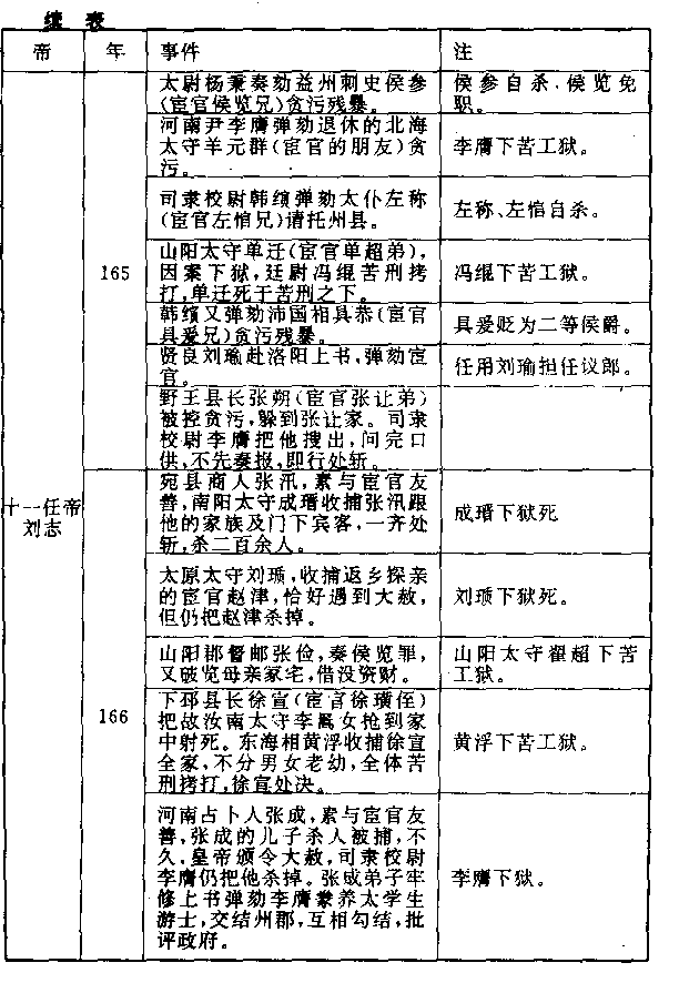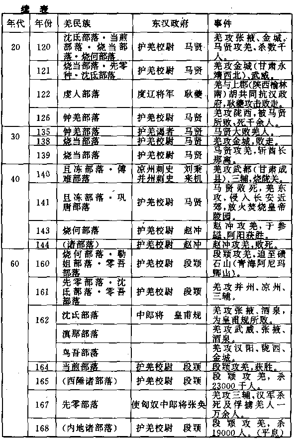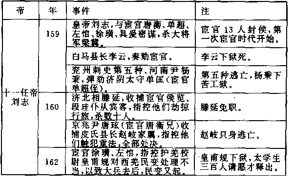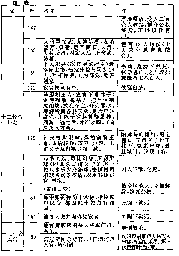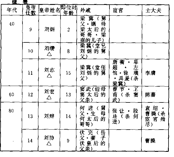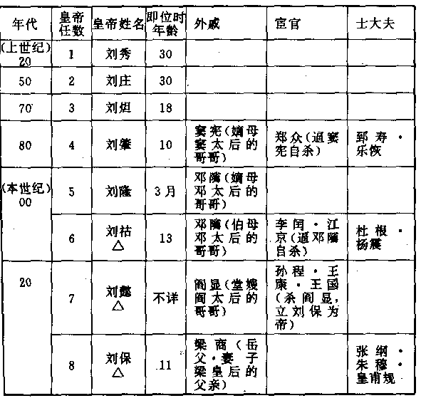 由上表可看出羌战的扩大情形,不但向东方中国本部推进一千余公里,而且每次战役,死亡人数都达数万之多,可推测参加战斗的兵力,当数倍或数十倍于此。羌民族已由消极的挣脱贪官,反抗暴政,进而发展到对汉民族全体仇视。不过,虽然如此,那个时代并没有现代意义的民族观念,本质上仍是单纯的官逼民反。因为政府官员贪残凶暴的对象,一视同仁,并不分什么羌民族汉民族。如一一五年,先零部落攻入益州(四川),东汉政府的大将尹就率军围剿,对汉民族同样奸淫烧杀,以致民间有两句可哀的口号:“强盗来了还可活,尹就来了定杀我。”尹就只不过一次小小的军事行动,根本没有发生战斗,给人民的伤害已如此惨烈,其他较大战役下的人民遭遇,使我们不忍想象。战争所到的地方,手无寸铁的善良农民或牧人和他们的家禽,同遭屠杀。整个西部中国,千里一片荒凉,白骨遍野,看不到煮饭的炊烟。幸而残存的人民,无论是羌是汉,饥饿使他们堕入吃人惨境。宰相邓囗甚至主张放弃纪元前二世纪死人千万,从匈奴汗国手中夺到的凉州(河西走廊),可看出当时官员的颟顸和情势的严重。 连绵一百二十年之久的巨大民变,因羌民族人口太少,惨重的伤亡使他们无以为继,有些部落几乎灭绝。到了一六九年,终于在东汉政府高压手段下屈服。高压政策取得了决定性的胜利,但付出的代价太大,包括撬开了东汉王朝覆亡的墓门。 羌战扩大声中,外戚政治再度在东汉中央政府形成。 外戚政治于纪元前一世纪,曾导使西汉王朝灭亡。刘秀建立东汉王朝,宣称西汉王朝的中兴,但他却没有能力采取有效行动以防止外戚政治的复活,反而走来走去,仍然走到外戚政治的断桥上。 东汉王朝执政人物可分别为三种:外戚、士大夫、宦官。外戚是古老力量,士大夫和宦官是新兴力量。这三种人物互相斗争,构成东汉王朝全部宫廷政治史。”我们用下表说明他们在斗争中的关系位置(皇帝下加上者,表示他并非前任皇帝的儿子,因前任皇帝没有儿子或其他缘故,由旁支坐上宝座。)
