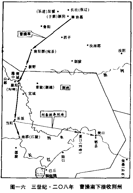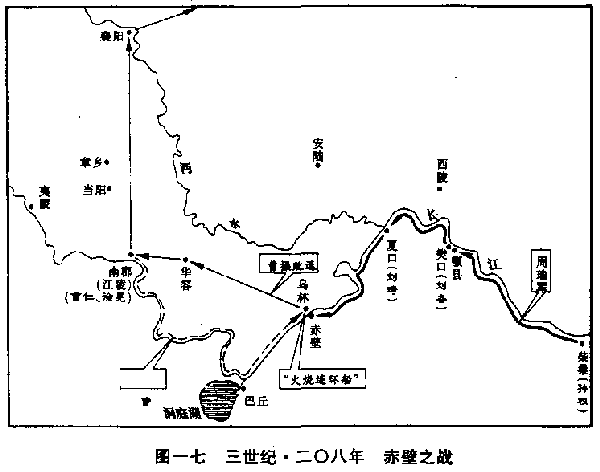 东汉王朝终于完结。 本世纪二十年代后,中国分裂为三个国家:曹魏帝国、蜀汉帝国、东吴帝国。被称为“三国时代”,自二二○年至二八○年,凡六十一年。三国时代以及三十年混战期间,产生了中国戏剧将近十分之一的故事材料,成为中国人最熟悉的时代。一部著名的历史小说——罗贯中著的《三国演义》,它发行的数量远超过司马迁的《史记》,更把这个时代的大小事件,传播的连儿童们都知道。我们要想了解这个时代,与其阅读正式史籍,不如去看那部小说。不过要特别小心的是,在作者笔下,曹操被歪曲为奸恶人物,诸葛亮被歪曲为会呼风唤雨,能够占卜算卦的巫师。 三国时代于本世纪初开始,而于本世纪末叶结束,新兴的晋王朝重新把中国统一。 以曹操为宰相的东汉政府的统一中国行动,遭遇到激烈的反抗。军阀们当然不愿中央政府恢复权力,他们很满意割据的现状。 曹操击败了袁绍后,把黄河以北诸州收置于中央政府控制之下。二○八年,再攻击以襄阳(湖北襄樊)为根据地的刘表。恰巧刘表逝世,他的儿子刘琮投降。投靠刘表的一支流亡军队的首领刘备,当时正驻扎樊城(与襄阳隔汉水相望的城镇),仓促南撤,到夏口(湖北武汉)跟刘表的另一个儿子刘琦会合。中央政府部队尾追南下,打算一举荡平刘备和盘据在江东(鄱阳湖以东地区)的孙权——孙策已死,由他的弟弟孙权继承。这时候,双方的兵力;极端悬殊,政府有二十万人(对外宣称有八十万),孙权充分动员也不过四万人,刘备、刘琦联军只不过可怜兮兮的一万人。刘备和孙权结盟,共同抵抗政府的攻势。刘备进驻樊口(湖北鄂州西北樊口镇),孙权坐镇柴桑(江西九江),派他的大将周瑜率领他所能投入战场的三万人,逆流迎战。政府二十万大军从江陵(湖北江陵)顺流而下,双方在赤壁(湖北蒲圻西北)会战,政府军大败。这一战役最大的影响是确定了分裂之局,中央政府再没有能力集结这么大的兵力。