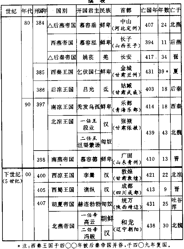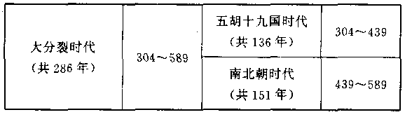 本世纪,中国进入大分裂时代。 大分裂时代起于本世纪三○四年,终于六世纪五八九年,纵贯第五世纪,长达二百八十六年。在大分裂时代中,又分为两期:前期五胡十九国时代,后期南北朝时代。我们用下表说明: