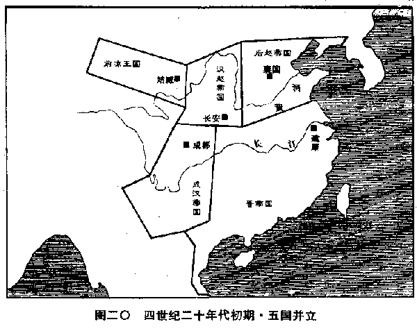 刘渊叹息司马颖是奴才,其实刘渊自己并不比奴才高明到那里去。他局促于并州(山西)甫部一隅,东迁西迁,最后定都平阳(山西临汾),始终不能扩张。假如不是大将石勒的游击战略把晋王朝的内脏挖空,刘渊可能归于覆没。刘渊于当了皇帝后不久逝世,经过一场夺位斗争,他的儿子之一刘聪继位。 ——中国历史上呈现一种现象,那就是改朝换代型的混战,大概总在三十年或四十年左右。如果超过这个时限太久,割据将变成长期性的。汉赵帝国不能乘新生的力量把晋政府一举消灭,战争就不可能停止。 晋政府皇帝司马炽在司马越留守部队护送裴妃及东海世子逃出洛阳后,像被遗弃的孤儿一样,无依无靠,哭天天不应,哭地地不灵,洛阳城里饥馑更严重,残余下来的居民互相刺杀,吞吃对方的尸体。司马炽想逃往东方的仓垣(河南开封东南),投奔一位向他表示效忠的大将,但当他和若干高级官员和眷属徒步走到铜驼街时——从皇宫正门直通洛阳南门,是当时中国第一条最繁华的街道。街上已长满荒草,饥饿的群众向他攻击。他大声喊叫他是尊贵的皇帝,而攻击更加激烈,大概疯狂饥饿的群众想到皇帝更肥,司马炽只好退回皇宫,坐以待毙。不久,汉赵帝国大军云集,洛阳在毫无抵抗下,悄悄陷落,司马炽被俘。刘聪问他:“你们司马家骨肉之间,为什么自相残杀的这么厉害?”司马炽说:“汉赵帝国受天命而兴,司马家的人不敢劳动你们动手,所以自己先替你们铲除。”这段话相当沉痛。刘聪封司马炽为侯爵,却要他穿上平民衣服,遇到宴会时,又教他跟奴隶们混在一起,给客人斟酒,但后来仍把他杀掉。 司马炽被杀后,他的侄儿司马邺,一个十四岁的孩子,被一批野心家带着逃到长安,宣布登极。但长安跟洛阳一样,也早成为一个孤岛,关中连年大饥馑,使长安比洛阳还要残破,这个数百年来一直是中国首都的区域,只剩下九十余户穷苦人家和四辆牛车。窘困到这种程度,根本无法生存。小朝廷勉强维持四年,到了三一六年,汉赵帝国兵临城下,司马邺只好投降。刘聪打猎时,教司马邺手执兵器,在前开路。去厕所时,又教司马邺给他扇扇子,然而最后仍是杀了他。 ——本世纪(四)○○年代和一十年代,中国境内三国并立汉赵帝国、成汉帝国、晋帝国。在晋政府不能控制全国的时候,我们不再称它为王朝。 五胡十九国都是短命王国,主要原因是,统治阶级一开始就严重的腐败,不知道珍惜他们的政权,加以它不是它所能负担的囗丧,使它一旦进入瓶颈,甚至还没有进入瓶颈,即行粉碎。我们用猴戏来说明,班主必须珍惜他衣食生命所寄托的猴子,假如不断使它饥饿,鞭打它,甚至乱刀砍它,它恐怕只有死翘翘。五胡十九国充满了不珍惜猴子的班主,当他们把猴子虐待死时,他们自己也只有跟着死,而且是惨死。