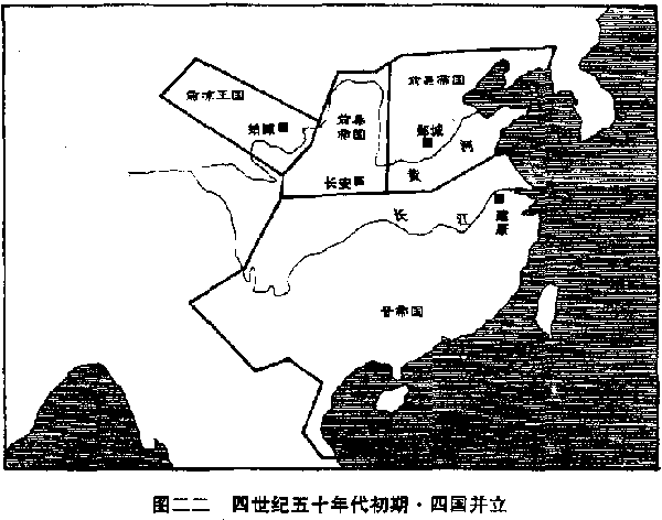 明年(三八五),前秦帝国瓦解的速度加快。西燕帝国在战败苻睿后,改变主意,暂时放弃东归的念头,进围长安。关中(陕西中部)氐民族既然大量迁出,苻坚不能再集结更多的武装部队,只好留他的儿子镇守长安,他自己突围向西,计划到南安(甘肃陇西)一带氐民族老根据地,动员兵力,再回来解救长安。可是大饥馑使长安不能固守,他一离城,就告陷落。苻坚西行到五将山(陕西岐山北),被后秦帝国的巡逻部队截获,送到新平(陕西彬县)石佛寺。姚苌向苻坚索取皇帝传国玉玺,苻坚大骂他忘恩负义,姚苌就把他缢死。姚苌于二十年前在绑赴刑场处斩时,被当时还是亲王的行坚救下来。所以连后秦的羌人部队,都为这一代伟人的悲剧,流下眼泪。 苻坚死后,他的儿子苻丕在晋阳(山西太原)继位,但前秦帝国已走到尽头。居住苑川(甘肃榆中)另一支鲜卑民族的一位酋长乞伏国仁,在勇士堡(甘肃榆中)独立,建西秦王国。又明年(三八六),淝水战役前夕,苻坚派往征服西域(新疆)的氐民族大将吕光于征服西域后胜利归来,走到姑臧(甘肃武威),听到苻坚死亡的消息,归途又被新兴起的西秦王国遮断,于是他就在姑臧当起王来,建立后凉王国。 同年(三八六),五胡十九国之外的另一国——由漠北鲜卑酋长拓拔珪建立的代王国(稍后改称魏帝国、史家称为北魏),在遥远的塞外盛乐(内蒙古和林格尔)悄悄崛起,它是一个微不足道的简陋政权,臣服后燕。但它不属于五胡的十九国,因为它的寿命比任何一国都长,长达一百七十一年,在大分裂时代后期的南北朝时代,担任主要角色。 ——本世纪(四)八十年代,中国境内八国并立:前秦帝国后燕帝国、西燕帝国、后秦帝国、西秦帝国、后凉帝国、北魏帝国、晋帝国。 前秦帝国瓦解,北中国一片混战,兵燹和大饥馑,纵横千里,都是枯骨。人与人之间互相残杀,煮食对方的尸体——这种悲惨的命运在中国历史上太多太多了。 三九四年,前秦帝国挣扎到最后一任皇帝苻崇,被西秦王国所灭,建国四十四年。同年,放弃长安,东进到长子(山西长子)建都的西燕帝国也被后燕帝国所灭,建国十一年。然而,三年之后(三九七),从后凉王国又分裂出两个王国:鲜卑民族的南凉和匈奴民族的北凉。中国境内,仍八国并立。 北魏帝国在塞北悄悄崛起,是一件当时没有人看到眼里的大事。它向后燕帝国进贡,以求得到保护。后燕帝国最初也确实尽到了宗主国的责任。可是后燕的开国皇帝慕容垂年纪日老,跟外界的接触也日少,由他那花花大少型的皇太子慕容宝掌握大权。三九一年,北魏帝国开国君主拓拔珪派他的弟弟拓拔觚,到后燕首都中山(河北定州)朝觐,慕客宝向他索取良马,拓拔珪拒绝。慕容宝就把拓拔觚扣留不放(这使我们想到纪元前六世纪九十年代楚王国宰相囗囊瓦)。两国关系,自此破裂。慕容宝对蕞尔小国的北魏竟不肯屈服,觉得大丧面子,他用种种方法在老爹面前挑拨,到了三九五年,已经昏聩了的慕容垂终于被激怒,命慕容宝率领九万精兵,讨伐拓拔珪。拓拔珪采取坚壁清野战略,慕容宝长驱直入,行军四百余公里,如入无人之境,一直抵达黄河北岸,不见敌踪。但与首都中山的联络,却被拓拔珪的奇兵切断,得不到后方消息。拓拔珪又教人散布谣言说,本已患病的慕容垂,已经死亡。慕容宝疑惧不安,最后只好撤退。退到参合陂(山西阳高)时,拓拔珪的大军追及,合围总攻,后燕兵围崩溃,一半战死,一半投降。拓拔珪对太多的降卒感到恐惧,于是纪元前三世纪长平关战役惨剧重演,降卒全被坑杀。仅慕容宝和幸运的数千人逃回。