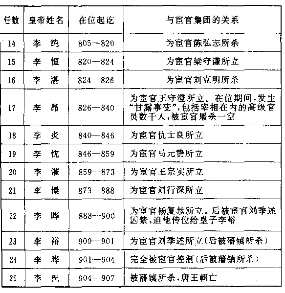 本世纪是一个黑暗世纪,全国混战。 所有战区都向河朔四镇看齐,最初只有少数成功,后来全都达到目的。那些无名而有实的独立王国,相互间不断并吞,不断扩张。中央政府控制区域,像烈阳下的冰块,最后只剩下首都长安(陕西西安)。 宦官的势力跟藩镇同时成长,终于出现中国第二次宦官时代,唐政府奄奄一息。 藩镇(战区)的世袭局面,原来只有四镇。自上世纪(八)唐王朝第十二任皇帝李适失去控制之后,其他节度使(司令官)都努力培植自己私人势力,希望也能割据一方。 李适的孙儿李纯于本世纪(九)八○五年即位,他决心完成祖父尝试失败的重振中央权威的政策。八○六年,西川战区(四川成都)节度使刘辟,要求兼任东川战区(梓州·四川三台)及山南西道战区(兴元·陕西汉中)节度使,李纯不答应,刘辟即行进攻梓州,强行接收。同年,夏绥战区(夏州·陕西靖边北)节度使韩全义退休,次年(八○六),他的外甥杨惠琳打算接任节度使,李纯也不答应,杨惠琳即行发兵拒绝中央派遣的新任节度使。明年(八○七),李纯征调镇海战区(润州·江苏镇江)节度使李钅奇入朝,李钅奇不接受命令。 李纯用铁腕对付三个叛徒,由效忠中央的军队分别讨伐。结果刘辟被擒,送到长安处决。杨惠琳被部下所杀。李钅奇兵败,被部下活捉,投降中央。刘辟是安史兵变后五十年中第一个因反抗中央而伏诛的节度使,使全国耳目一新。八一四年,彰义战区(蔡州·河南汝南)节度使吴少阳病死,他的儿子吴元济继位,中央拒绝承认,下令讨伐。经过三年的战斗,最后把吴元济活捉,送到长安处决,这是第二个因反抗中央而伏诛的节度使。一连串整肃纲纪的胜利,使河朔四镇大为震惊,他们立即取消世袭,缴回行政财赋大权。四镇之一的平卢战区(郓州·山东东平)节度使李师道,更献出三个州给中央。但他马上又懊悔失去的土地太多,临时变卦,中央政府再对他讨伐,李师道被部下杀死。 到现在为止,中央政府权威达到高峰,正常的政治秩序再告恢复。然而这不过只是回光反照,就在摧毁平卢战区,完成全国再统一的明年(八二○),李纯被宦官刺死,他的儿子李恒继位。李恒是一个花花大少,他父亲多少年辛苦征战所得到的成果,几乎是霎时间就全部丧失。河朔地区中的卢龙(北京)、成德(河北正定)、魏博(河北大名)三镇,发现中央政府恢复腐败时,就首先恢复实质上的独立王国,其他藩镇也陆续恢复割据或半割据原状。 战区拒抗中央政府,司令官拒抗最高统帅。司令官因失去统御的合法力量,自己也有被部下拒抗的危险。事实上也正是如此,各藩镇内部不断发生叛变,将领们会突然间向节度使攻击拥立另一位将领当节度使,而对旧主驱逐或杀戮。节度使为了预防内部叛变,乃采取彻底的愚民政策,在他所管辖的战区之内,人民婚丧宴会,跟平日的拜神拜庙,都被禁止。亲友之间,不准有太多往来。知识分子都怀有大一统思想,对割据形态有不利影响,所以更成为迫害对象,学校一律封闭。又限制对外交通,切断商旅。这样作的目的是,使战区孤立,战区内每一个人也孤立,孤立即不能集结力量。于是社会经济和教育文化,全部破坏。尤其是河朔四镇!简直成为一片蛮荒,社会上没有人读书,人民也不识字,商业凋零,生产停顿,残破的程度,比大分裂时代五胡十九国时代,还要严重。 然而,历史定律是,纯高压并不能制止叛变。藩镇内部的拒抗事件——主要的是兵变,不断发生,遂使混战的范围更加扩大。 促使唐王朝崩溃的,除了藩镇外,还有宦官。 自从第二世纪第一次宦官时代之后,六百年间,宦官的影响,只是个别现象。到了上世纪(八),才有突破性的发展。 唐王朝第一位有名的宦官高力士,他是李隆基和贵妃杨玉环的贴身侍从,因为太接近权力魔杖,虽然高力士并不喜爱政治,但权势仍震慑朝野。连皇太子李亨都唤他“二哥”,公主驸马都尊称他“老太爷”。但真正揭起宦官时代帝幕的,还是安史兵变。安史兵变后,皇帝对将领们充满猜忌,而只信任宦官。于是发明一种此后几乎遗害一千年的监军制度,派遣宦官出任监军。不但战区设有监军,就是比战区小两三级的军事单位,也都设有监军。武装部队中遂形成两个系统,一是传统的军事系统,一是可以直达皇帝御座的宦官系统。监军的任务,表面上是帮助解决困难,事实上是在防止叛变。 所以监军是一个权威的职位,一纸密告,就可以使统帅人头落地。中央第一位讨伐安禄山的统帅高仙芝(但罗斯战役大将)和副统帅封常清,就因为不能满足监军宦官边令诚的勒索,边令诚密告他们谋反,他们遂被双双处斩。二人死于上世纪(八)七五五年,即黄金时代结束,安禄山兵变之年。不过最妙的是,当安禄山攻陷潼关,向长安挺进时,边令诚带着皇宫钥匙,却第一个投降。 宦官既有如此可怕的力量,在军中自然呈现特殊面貌。他把健壮骁勇的战士全部选拔出来作为自己的卫队,而把挑剩下的老弱残兵拨给统帅。交战的时候,稍有胜利,宦官立即派人飞马向长安报告,功全在己。一旦失利,罪过天经地义地全罩到统帅头上。皇帝们又都跟第五世纪南宋帝国的皇帝刘义隆一样,喜欢遥控指挥。深宫中发出命令下达给宦官,宦官再传达给统帅。每一次战役,宦官就像过江之鲫般地在道上奔驰,看起来煞有介事。 ——懂军事的人绝不遥控指挥,遥控指挥的人一定不懂军事,或对军事一知半解。所以一个政府一旦出现遥控指挥,便是一种