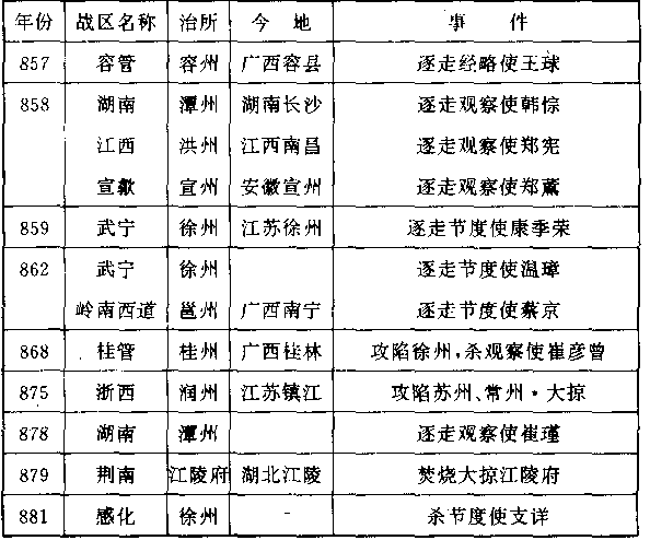 (此表所列事件不全,有遗漏,如八七五年昭义军乱、大将刘广逐走节度使高奖,自为留后等,即未列,故此表可作大要视之——编者) 表中官称:节度使是一级战区司令官。观察使是战区行政长官。经略使是低级战区司令官。 兵变的起因,千篇一律地由于司令官的昏噩和贪暴。出任司令官的人,往往不是靠才干而是靠谄媚和巨额贿赂。谄媚自身可以具备,贿赂则多半来自商人的高利贷款。当时人称这一类的司令官为“债帅”,他们到任后的第一件事就是贪污,以求偿还贷款。第二件事是继续贪污,以便用继续贿赂来保持职位。贪污的方法很多,主要的则靠冤狱,像表中岭南西道战区节度使蔡京,他为了勒索,所用的酷刑之中,竟有纪元前十八世纪的“炮烙”一种。世界上最野蛮的海盗在勒索赎金时,都不会如此。 影响最大的一次兵变发生在桂州(广西桂林)。南诏王国于本世纪(九)又因不能忍受唐政府边疆官员的骚扰而与中国决裂,曾两度攻陷交州(越南河内),中央政府命全国各战区派兵赴援。其中由武宁战区(徐州·江苏徐州)派出的二千人的部队,于六十年代八六三年春,进驻桂州。政府宣布的是三年为期,期满即行调回。八六五年冬,三年期满,战区官员遥远地颁下一纸命令,续延一期,声明绝不再延,他们只好在三千公里外的蛮荒异乡,再驻屯三年。到了八六八年,第二期又满,大家高高兴兴准备返乡之际,战区官员又遥远地颁下第二纸命令,再延续一年。而一年后会不会再续延下去,没有人敢肯定回答。他们向战区所作的申诉请求,都像撞到石头上。思乡的士兵除了叛变外,可能在十年二十年后都不能回去。于是他们决定自己回去,推举一位负责管理粮秣的低级军官庞勋当领袖,攻破军械库,取得武器,即向东挺进。沿途摧毁所有的抵抗,势如破竹。中央政府这才大为震动,一面下令大赦,准他们回乡;一面命沿途地方政府予以照料保护。庞勋和这一队被逼反的战士不是傻瓜,他们知道一旦回到徐州解散,接着就是一网打尽的逮捕和屠杀。所以在抵达徐州之后,即行攻城。城垣不久陷落,坚持主张延期的大营总管理官(都押牙)尹勘、训练司令(教练使)杜璋、作战司令(兵马使)徐行俭,全被捉住剖开肚肠。以严苛闻名的节度使崔彦曾,囚禁了一些日子后也被处决。 政府征调大军讨伐,但无法取胜,最后靠蔚州(河北蔚县)州长(刺史)李国昌的沙陀兵围,才把庞勋击溃。叛变历时只有一年零五个月,并不算久,但在一年零五个月中,几乎每天都有血战,双方死伤,有十余万人。长江流域和黄河以南地区,大部分残破。庞勋以二千人敢向中央政府挑战,而且不断获胜,显示政府军在腐败的债帅统率下,已丧失了战斗能力。假设没有沙陀兵团的介入,没有人敢预料它的发展。 沙陀是突厥民族的一支,定居在蒲类县(新疆奇台东南)之东。上世纪(八)中叶,中国丧失西域(新疆及中亚东部)之后,即归附吐蕃王国,作侵略中国的先锋。但因为他们太骁勇善战,引起吐蕃的戒惧,打算把他们南迁。沙陀部落得到消息,即于本世纪(九)○○年代,转战东奔,向中国投降。唐政府把他们安置在灵州(宁夏灵武)附近。三十年代时,曾袭击回匕汗国的王庭。以后逐年东移,屡次帮助唐政府建立功勋,唐政府就任命它的首长李国昌担任蔚州州长(刺史)。 庞勋兵变在高压下平息,但政府的胜利只是下一次更大失败的前奏。 使唐政府遭受下一次更大失败的是农民。 中国与外国贸易频繁,财富集中于商业都市。社会的外貌繁荣,并没有刺激工业发展,反而使农民受到更大的剥削。当时的社会现象是,纯商人不容易立足,必须与官员结合,或是商人兼任官员,或是官员兼营商业,官商之间,很难区别。当权官员的惊人奢侈和必须付出的惊人贿赂,使他们永无间断地需要大量的外国珠宝,如玛瑙、翡翠之类。购买这些珠宝的巨款,全靠冤狱。举一个例子即可明了,当农民们辛苦织成绸缎之后,官员并不需要拿钱购买,他只要把农人逮捕入狱,指控他谋反就可以了。等到农民悉数缴出他的产品之后,自然会得到平反或赦免。占中国出口货物大宗的丝织品,所带给农民的不是财富,而是灾祸。此仅仅一端而已,战争的屠杀,乱兵的焚烧劫掠和合法的沉重赋税,使农村普遍而彻底地破产,惨不忍睹。我们用唐王朝的两位诗人的两首诗,代作说明: 乳燕人巢(下征下旬)成竹,谁家二女种新谷。无人无牛不及犁,持刀砍地翻作泥。自言家贫母年老,长兄从军未娶嫂。去年灾役牛囤空,截绢买刀都市中。头巾掩面畏人识,以身代个谁与同。姐妹相携心正苦,不见路人唯见土。疏通畦垄防乱苗,整顿沟塍待时雨。日正南冈午饷归,可怜朝雉扰惊飞。东邻西舍花发尽,共惜余芳泪沾衣。(塍,稻田土垄。) 谁知苦贫夫,家有愁怨妻。请君听其词,能不为酸凄。所怜抱中儿,不如山下囗。空念庭前地,化为吏人蹊。出门望山泽,回头心复迷。何时见府主,长跪向之啼。(囗,鹿的幼子。蹊,道路。) 第一首叙述两个幼女的唯一的哥哥被征去当兵,父亲早死,母亲卧病在床,无人耕田,她们只好以人代牛,用刀代犁。我们可以隐约地看到两位小女孩,蹲在烈日之下,一面哭泣,一面用刀砍那坚硬的泥土。第二首叙述一个农妇,抱着命运不如鸡犬的婴儿,在等待着“府主”(地主官员)出现,跪求怜悯。 千载以下,读者都会为她们落泪,都可以看到她们那孤苦无告、枯干的面颊上恐惧绝望的眸子。但当时的统治集团却无
