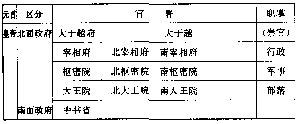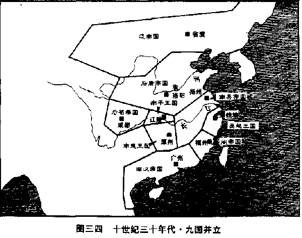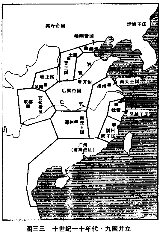 由此表可以了解,所谓五代十一国,只不过把藩镇的招牌改上一改,节度使改称帝王,战区改称帝国、王国。所以有些政权并不能适用严格的国家意义。如岐、南平、南楚、吴越,往往维持着藩镇的外貌,在表面上臣属于中原的五代政府。尤其是南平,它为了得到赏赐,几乎向每一个邻邦称臣,各国都唤它的国王(节度使)为“高赖子”。可是,这种臣属,只是表面,绝对不接受内政的干预。 朱温建立后梁帝国同时的○○年代,中国即行四分五裂。北方有晋王国(后唐帝国前身);西方有歧王国、前蜀帝国;南方有南吴王国(南吴帝国前身)、吴越王国、南楚王国、闽王国(闽帝国身前)——八个短命政权并立。 八个短命政权中的晋王国,理论上它仍是已灭亡了的唐王朝的领土。李克用以唐王朝所封的爵位晋王和所任命的“河东战区节度使”身份,起兵讨伐叛逆朱温。九○八年,李克用逝世,他的儿子李存勖继位。另外,设置于幽州(北京)的卢龙战区,节度使刘守光于九一一年宣布独立,建桀燕帝国。 后梁建立帝国第十年,九一六年,居于长城之北、匈奴汗国故地的契丹部落,也建立帝国。契丹是东胡民族的一支,在第七第八世纪时,中国唐政府曾封它的酋长为松漠都督。它内部共有八个大部落,大部落酋长称为“大人”。由此八位大人互推一位首领,负责处理有关部落间的大事,任期三年。本世纪(十)初叶,当选首领的耶律阿保机用盛大宴会招待其他七位大人,伏兵把他们杀掉,使八大部落合并为一。他不采用北方游牧民族所习惯的“可汗”称谓,而采用皇帝称谓,称他的帝国为契丹帝国,不久再改称辽帝国,定都西楼城(内蒙古巴林左旗。后西楼城已改称临潢)。北方游牧民族有固定的首都,由辽帝国开始。说明他们的经济社会已进入渔猎和农业。 自从七世纪中国击溃东突厥汗国后,二百余年来,北疆一直保持某种程度的和平。现在,庞大的辽帝国崛起,塞北其他民族各部落在契丹兵团铁蹄下,归于统一,中国同时也恢复了北疆的传统性的沉重外患。辽帝国于二十年代九二六年,向东征服位于松花江流域、比它文化水准要高得多的渤海王国,向西又陆续拓展到阴山以西,影响力直到天山(新疆)。它的北界到黑龙江,南界则隔着长城,跟小分裂时代凌乱而又混战不息的中国为邻。 中国本土混战,使沿边一带汉人大批流入安定的辽帝国国境,它的首都临潢,被称为上京,汉人几乎占人口的三分之一。其他地区也都有专居住汉人的街市城堡,一律称为?汉城”,越向南这种汉城越多,带给契丹人工农业高级生产技术和更高级的国家管理技术。契丹人所以能超越突厥、回匕,建立起来一个现代化的帝国,全靠汉人的贡献、所以辽帝国把汉人当作智慧之源,对汉人有特别的保护——主要的是严厉防止汉人逃回中国。这种对汉人重视的政策,从下表所列它的政府组织上,可以看出: