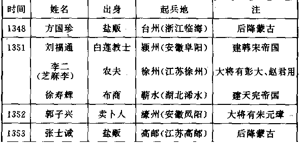 上表显示出两个特征,第一、群众领袖都是平民出身,没有一个是士大夫。说明士大夫爱国的言论多于爱国的行动,即令有行动,也没有影响力。第二、推翻蒙古统治的,只有民变而没有政变和兵变,说明在蒙古帝国里,政权、军权都在蒙古人手中。蒙古人认为仅此一点,汉人就无可奈何,料不到民变一旦发生力量,跟政变、兵变一样地具有摧毁性。 正当汉民族革命排山倒海而起之际,蒙古帝国政府却在决策上犯了一项错误,即引使黄河恢复故道。工程由宰相脱脱亲自主持,一三五一年,征调民夫十七万人,用五个月工夫,把白茅堤(河南兰考东北)决口堵塞,使黄河仍向东北流入渤海。这本是一件建设性的伟大工程,但它选错了时间,尤其是用错了方法;在人心沸腾的年岁中,把十七万满怀怨恨的劳工,从他们的家乡强逼征调,集中在一起。完工之后,又没有妥善安置,而任他们向四方流散。刘福通早就命他的教徒,刻一个一只眼的石人,背上写着:“石人一只眼,挑动黄河天下反。”埋在黄河故道黄陵岗(河南兰考东北)附近。当民夫在施工中把这个石人掘出来的时候,人心大为震动。工程完毕后,除了少部分还乡外,大多数都集结在刘福通的红巾之下,成为主力。红巾,跟二世纪的黄巾一样,是刘福通抗暴力量所使用的一种标帜。 就在同年(一三五一),群众领袖之一的徐寿辉称帝,建立天完帝,占领长江中游,派军进入江南,扫荡蒙古势力。刘福通于一三五五年,迎立白莲教故教主韩山童的儿子韩林儿称帝,建立韩宋帝国,占领淮河流域和黄河以南地区,整个中原进入掌握。 白莲教是佛教中的一个神秘支派,以反抗暴政为重要宗旨,就是韩山童开创的。韩山童曾宣称:“白莲花开,弥勒佛降世。”设立白莲会,吸收信徒。 ——关于汉人的抗暴革命,有一个流传甚广的民间故事。据说,刘福通最初在颖州(安徽阜阳)发动民众暴动时,因蒙古“甲主”监视严密,汉人既不能聚会宣告,又不能派人逐家传递消息,无法约定同一时刻举事。于是刘福通请“甲主”准许向家人分送像月亮一样的圆形甜饼,称为月饼,以便汉人为大汗祈福。“甲主”允许了,而月饼中夹有中国字写的字条:“八月十五日杀鞑子。”汉人准备妥当,当晚夜半,所有“甲主”和他的家族,都死在汉人棍棒之下。 ——金帝国和蒙古帝国崩溃时,凡在中国的女真人和蒙古人,几乎全部被汉人屠杀,连怀中的婴儿都被摔到石阶上,脑浆迸裂,作母亲的还没有哀号出声音,已死于乱刀之下,凶惨不忍卒睹。然而这是可以理解的,汉人所负的是民族深仇。女真和蒙古统治阶层的残忍屠杀,举世皆知,对被称为“蛮子国”的汉人,更加轻蔑。像兴化(福建莆田)不过一个小城,上世纪(十三)蒙古兵团攻陷它,全城男女被屠之后,就血流有声。侵略者必须付出代价,即令本身没有付出,后裔也要付出。这种付出使人对佛教的因果报应,发生联想,会禁不住悚然叹息。 韩宋帝国宰相刘福通是反抗蒙古统治最伟大的民族英雄,他毫无私心地用他新兴的武装力量,打击当时世界上最强大的蒙古帝国。一三五八年,他于攻陷开封(河南开封)作为首都后,即向蒙古发动总攻,分三路进兵。东路由大将毛贵率领,攻山东省;西路由大将白不信率领,攻陕西省;北路由大将关先生率领,攻上都开平(内蒙古正蓝旗)。东路兵团于扫荡了山东省蒙古人的势力后,直指大都(北京),挺进到距大都只五十公里的柳林村蒙古第十八任大汗脱欢帖木儿,一个标准的亡国型君主,手足失措,准备放弃大都,向北逃亡。但宰相拓拔太平(即汉人贺惟一)坚持固守。毛贵攻击不顺利,孤军不能久留,仍退回山东。西路兵团深入关中(陕西省中部)后,战败溃散。只北路兵团势如破竹,穿过山西,摧毁蒙古所有抵抗,攻陷开平。开平距作为首都的大都只二百八十公里,我们不知道他们为什么不南下攻大都,先行把蒙古大汗擒获。北路兵团没有这样做,却向东推进,攻陷辽阳(辽宁辽阳),进入高丽王国(朝鲜半岛),高丽向北路兵团投降。可是,这批所向无敌的革命部队,经过长途远征,军纪已全部败坏,引起高丽人民极大的痛恨。高丽有计划地出动大批美女,跟战士们交往缠绵,男子们则乘机把他们的战马和武器藏匿。一切妥当后,发动反击,包括关先生在内,大部分被杀。只剩下万余人辗转脱险,逃回中国,又被盛怒等待他们的蒙古人,一网打尽。 韩宋帝国三路出征,把自己的力量完全消耗。但蒙古帝国的墙基,却被掘空,只需要最后轻轻一推。 对蒙古帝国最后一推的是朱元璋和他所建立的明帝国。 朱元璋是韩宋帝国的将领之一,他生于一个极度贫苦的家庭,父母双双死于瘟疫,他以一个孤儿,投入他故乡钟离(壕州·安徽凤阳)皇觉寺当小和尚,供大和尚当役使。然而遍地混战又把庙院毁掉,他只好铤而走险,去当“盗匪”,投奔变民领袖郭子兴。郭子兴欣赏他的才干,把好友的女儿马氏嫁给他,用他作自己的卫士,以后又任命他当军官,逐渐擢升到重要地位。韩宋帝国建立后,郭子兴这支武装力量即行归附。郭子兴不久逝世,韩宋政府任命郭子兴的儿子郭天叙当司令官(都元帅),朱元璋当副司令官(副都元帅),渡长江南征。朱元璋这时野心勃勃,决定排除他的思主之子。在进攻集庆(江苏南京)时,朱元璋的好友陈野先叛变,把郭天叙杀掉。然后朱元璋再把陈野先杀掉。韩宋政府无法作深入地追究,只好任命朱元璋接任司令官兼江南省省长(江南行省平章事)。朱