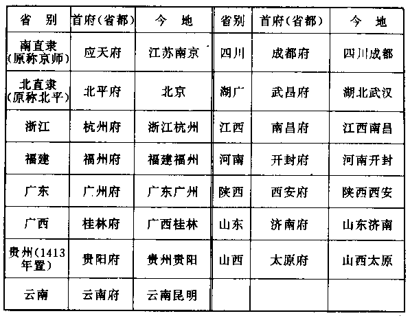 朱元璋建立的明王朝,接替元帝国的疆域,只漠北地区不包括在内,那里是蒙古帝国本土。明政府把全国划为下列的十五个行政区域: