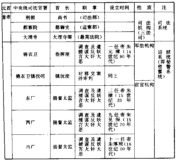 刑部负责法律的制定和颁布,管辖全国各地司法机构,有权提审它认为不恰当的案件。都察院负责对不法事件纠察检举,并派遣官员(御史)分赴各地,担任“巡抚”官职,接受人民对官吏的控诉,它也可以审理,也可以判决。大理寺类似国家最高法院,负责对前二机构的审判,作最后裁定。它们被认为“三法司”,是政府正规的司法系统。三法司当然地是在皇帝绝对控制之下,但朱元璋认为它们仍有理性成分,于是另行设立他直接指挥的“锦衣卫”(锦衣卫亲军指挥使司),即首都治安司令部。锦衣卫内设“镇抚司”,即军法处。锦衣卫逮捕罪犯,拷打出口供后,即交镇抚司判刑处决。如臂使指,快捷了当,没有任何顾忌。胡惟庸、蓝玉等五万人的两大冤狱,就是锦衣卫完成的使命。 然而,朱元璋的后裔认为锦衣卫的理性仍未能完全泯灭,于是,下世纪(十五)时,再创立“东厂”,又创立“西厂”。下下世纪(十六)时,更创立“内厂”,由皇帝最亲信的宦官主持。本已布满全国的秘密警察,遂互相交错,密如蛛网,这是中国前所未有的现象。街头巷尾的一举一动,夫妻争吵和市井打斗,早上发生,晚上就到了皇帝耳朵。宦官主持诏狱最大的方便,是他可以随时向皇帝直接提出报告,皇帝可以随时向宦官发布命令。宦官具有雷霆般威力,无人可以抗拒。所以罪犯如果落到三法司之手,还有活命的希望或不受苦刑的希望,一旦被“厂”、“卫”逮捕,没有一个人能够幸免。 对人权具有同等摧毁功能的,还有廷杖。廷杖,即在大庭广众之下,用木棍对罪犯拷掠(打问)。它是逼取口供的工具和追赃的工具,也是刑罚的一种。一个人如果被处罚廷仗一百以上,他所接受的即是死刑,而且是极端痛苦羞辱的死刑。在延杖制度下,上自宰相,下至平民,没有人能维持人性的尊严。对高级官员(部长副部长以上)执行廷杖时,一定有宦官高坐中央监刑,其他政府官员则陪坐两旁,左边站小宦官三十人,右边站锦衣卫三十人,庭下站行刑狱吏百余人,都穿短裤,手执木棍。宦官向“犯罪”的大臣宣读皇帝的诏书(判决书)后,“犯罪”大臣立即被行刑狱吏扑上来,扌卒伏倒地,用麻布把他从肩膀以下绑住,使他不能转动。再把他双足用绳索绑住,由壮士四方牵拽握定,只露出臀部和腿部,接受廷杖。廷杖时,受刑人痛苦难忍,大声哀号,头面撞地,尘土塞满口中,胡须全被磨脱。这是一副惨不忍睹的摧残人权的图画,朱元璋用它对付中国人民。 强壮的人可支持八十下,超过一百的往往即在杖下毙命。不死时,也要割去败肉数十碗,医治半年以上。锦衣卫行刑狱吏,都受过特别训练。如果得到满意的贿赂,他们打下的木棍,看起来很重,甚至血肉横飞,但受伤较轻,痛苦也较轻。如果家庭贫苦,无钱行贿,他们下杖时看起来很轻,皮肤也不破,但痛彻心腑,只三四十杖,静脉血管就会寸寸切断,全部肌肉组织溃散,不久即死,无药可救。 英国于一百年前的上世纪(十三),即颁布《大宪章》,保障人权,非经过法院审讯,对人民不得逮捕监禁,而中国却出现诏狱和廷杖。 明政府建立之初,仿效韩宋帝国,中央政府设立下表所列的三个机构,作为中枢。由中书省首长,担任宰相,作为皇帝的助理。中书省内设立六部,负责全国行政。