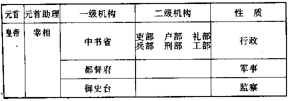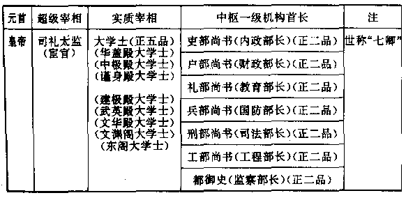 本世纪(十四)八十年代,朱元璋诬陷宰相胡惟庸谋反后,即下令撤销中书省编制和宰相职位。摆升六部为一级中枢机构,各部首长(尚书)直接向皇帝负责,皇帝不再设立助手,而直接向各部发号施令,已经够专制的政府,此后进入更绝对的专制。朱元璋另外成立一个秘书机构,称为“内阁”,所委派的秘书,称为“大学士”。大学士冠有某殿某阁字样,以资分别(殿阁都是宫廷中的建筑物)。大学士的职位很低,只正五品,比各部首长(尚书·正二品)要低三级,等于各部最低的助理科员。 中国有史以来在政治上占重要位置的宰相制度,从此消失。皇帝遂在没有助手帮手的情形下,单独处理帝国事务。朱元璋对此一措施沾沾自喜,认为是他最高智慧的结晶,可以永远保持明政权于不坠。所以他下令说:“后世子孙永不许恢复宰相制度,如果有人如此请求,即以叛逆论罪,凌迟处死。” 然而,问题就发生在皇帝身上,朱元璋来自民间,政权又由他创立,对繁琐的政务,还可以勉强应付。但他的后裔却是一群花花大少——而且是一群恶少,生长在深宫之中和女人、宦官之手,面对着千万种变化莫测的帝国事务,必然手足失措。本世纪(十四)末年,朱元璋平均每日要亲自批阅一百五十件奏章,裁决四百种案件。从前有宰相可以帮助皇帝,如今没有人能为他分担,他也不准别人分担。花花大少皇帝只有依靠内阁,命那些大学士在每一个奏章或案件上,签注意见,写出对该事的分析和应如何反应的建议,甚至皇帝颁发命令的草稿,都一并拟好呈上。——当时术语称为“票拟”和“条旨”。皇帝即根据这些签注,加以批示。于是,不久之后,大权遂渐渐滑入大学士之手。大学士成为没有宰相名义的宰相,内阁也成为没有中书省名义的中书省。 内阁大学士有数人之多,并不是每一位大学士都可签注意见,必须资格最高,深得皇帝信任的人(往往是华盖殿大学士,华盖殿后来改为中极殿),此人即世人所称的“首相”——首席宰相。但大学士毕竟不同于正式宰相,正式宰相可以单独推行政令,大学士便无此权。他只能依靠“票拟”一一签注意见,来窃弄皇帝的权力,只有黑市地位,没有法定地位。 更主要的原因是,大学士跟皇帝之间,还有一段距离。对皇帝如何裁决,是不是依照他签注的意见裁决,甚至会不会作相反的裁决,大学士都不知道,他们也很少有向皇帝当面陈述解释的机会。事实上,到了后来,皇帝深居宫中,不出来露面,大学士遂数月数年,或数十年,都看不到皇帝的影子。他只有依靠这种脆弱的“票拟”,维持权力。而此票拟,却要仰仗宦官转达,并仰仗宦官在皇帝面前作补充说明。皇帝所颁发的命令,也由宦官传递,有时用批示,有时用口头,宦官的权力遂日形膨胀。而皇帝和大学士之间,往往互不认识。皇帝对大学士的印象,全来自宦官的报告。于是,政府大权又从大学士手中滑出,滑到宦官之手。我们可用下表显示明政府在下世纪(十五)中叶后所呈现的组织形态。必须对此形态了解,才能对明王朝了解。