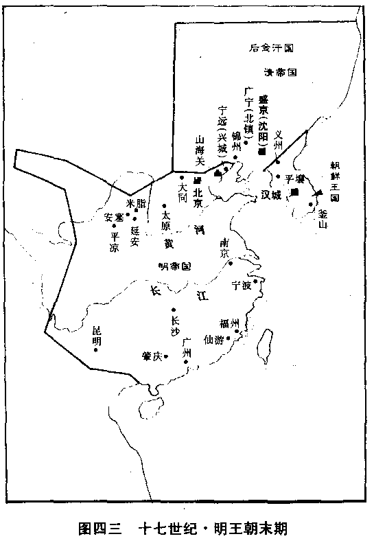 阿台的覆灭和党昌安父子之死,使建州三卫的政治组织瓦解,部落星散,各自为政,这正是中国明政府所企求的。然而,塔克世的二十八岁的儿子努尔哈赤,是一个雄才大略的人物,他跟十三世纪蒙古帝国开国大汗铁木真的遭遇,几乎完全相同。努尔哈赤自幼丧母,不堪继母的虐待,离家流浪到当时中国东北重镇抚顺(辽宁抚顺)。因祖父和父亲跟明政府都有密切关系的缘故,他有机会出入辽东兵团司令部(在辽宁辽阳)跟李成梁的私宅,对明政府的贪污无能和军队的腐败,有深刻的印象。又因广泛地跟异民族的汉人来往,使他的胸襟和智慧,日益开阔,他追求高等知识过程中,《三国演义》和《水浒传》两部小说,在他身上产生极大的影响,使他不久就成为一个受部落爱戴的军事统帅和政治领袖。 努尔哈赤从他父亲那里,只继承了十三副盔甲和叛变逃亡后剩下的数十名部众。他收拾残局,忍辱负重,捕杀背叛中国的同族女真人,以表示对明政府的忠心耿耿。再加上他祖父、父亲同时为中国牺牲,努尔哈赤遂被明政府正式任命为建州卫代理司令官(都督企事),努尔哈赤即利用这个官衔所赋予的影响力,壮大自己。 三年后(上世纪一五八六年),他击斩尼堪外兰。 二十五年后,到了本世纪(十七)一六一六年,羽毛丰满。努尔哈赤正式称可汗,建立后金汗国,以继承覆亡于十三世纪的他祖先们的金帝国的大业。一六一八年,努尔哈赤以“七大恨”祭告天地,宣布他脱离明政府,和跟明政府对抗的理由。七大恨中的第一大恨就是明政府杀了他的祖父和父亲,其他六大恨不过一些微不足道的鸡毛蒜皮小事。 发表七大恨的次年(一六一九),中国辽东军区总指挥(辽东经略)杨镐,这位在保卫朝鲜战役中全军覆没的债帅,动员精锐边防军九万人,包括从南方出击的朝鲜兵团一万人,分四路讨伐后金汗国,准备一举把这个初起的叛乱集团摧毁。努尔哈赤集结六万人抵抗,在萨尔浒(辽宁抚顺东)鏖战六天,杨镐大败,四万五千人阵亡,朝鲜兵团投降后金,而后金汗国只死了二千余人。努尔哈赤乘胜进攻,一连攻陷开原、铁岭。这是明政府最早一次,也是最后一次主动出击,从此只有挨打和逃跑的份。 两年后(一六二一),后金汗国攻陷抚顺、辽阳、沈阳。明政府任命熊廷弼担任辽东军区总指挥(辽东经略),而另任命王化贞担任辽东军区司令官(辽东巡抚),这是大黑暗时代最流行的双线领导制度,目的在互相牵制,防止叛变。总指挥和司令官的权力和责任,很难划分,熊廷弼是继于谦之后中国最伟大的军事天才,他对领悟力较弱的蠢庸之辈,感到不能忍受,所以他的人缘不好,高高在上的那些官僚政客,尤其厌恶他,他的官位虽然理论上比王化贞稍高,但王化贞有国防部长(兵部尚书)作他强硬的靠山,所以熊廷弼指挥不了他,熊廷弼只有四千人的部队,驻防山海关(河北秦皇岛东北)。王化贞则拥有重兵六万,驻在山海关之北二百四十公里的广宁(辽宁北宁)。王化贞跟十一世纪的范仲淹一样,善于对内宣传,他宣称只要政府一声令下,他的大军立刻就可以把努尔哈赤一举荡平。熊廷弼深知道边防军腐败已极,没有战斗力量,坚持主张采取守势,不可轻率挑战。但王化贞壮烈的言词,和用克扣军饷行使贿赂,收到预期的效果,北京大多数重要官员都支持王化贞,一致抨击熊廷弼懦弱无能和刚愎自用。问题是,努尔哈赤并不支持王化贞。第二年(一六二二),当王化贞兴高采烈地招降纳叛,准备出击时,后金兵团先发制人,用闪电战术突击广宁(辽宁北宁),王化贞六万人覆没,只身逃走。 这次战役跟熊廷弼无关,但宦官巨头魏忠贤认为跟他有关就跟他有关了。熊廷弼被逮捕下狱,三年后(一六二五)斩首。熊廷弼死时,王化贞虽然也在监狱里,但他仍然活着,在大量贿赂下,高级官员继续支持他,并且有数万被雇佣的职业群众,在北京街头示威,为卓越的王化贞将军呼冤。 王化贞的失败,使明政府在东北的土地,即辽东军区,丧失了百分之九十九,山海关外,只剩下锦州(辽宁锦州)、松山(辽宁锦州南松土堡)、宁远(辽宁兴城)三个孤城。宁远在山海关东北一百一十公里,由年轻有为的将领袁崇焕防守。 努尔哈赤于击败王化贞后,即把首都从赫图阿拉城(辽宁新宾)迁到刚从明政府手中夺取的辽阳(辽宁辽阳)。三年后(一六二五)再迁都沈阳(辽宁沈阳),步步进逼明帝国。明年(一六二六),努尔哈赤亲统十一万没有战败过的精锐兵团,围攻宁远,企图把山海关外的明政府的势力,全部肃清。结果遭到失败,努尔哈赤被守军使用的葡萄牙巨炮击中,重伤而死。 努尔哈赤的逝世对后金汗国没有重大影响,这是新兴政治力量的一种重要考验。他的继承人皇太极于老爹死后的次年(一六二七),对宁远发动第二次攻击,被袁崇焕第二次击退。皇太极在回军途中顺便进攻锦州,又被守军击退。明政府宣传这次战役是“锦宁大捷”。 皇太极同他老爹一样的干练,他综合分析宁远城外失利的结果,得到一个结论。认为明政府虽然困于国内如火如荼的民变,日趋衰弱,但边疆上的重点实力仍不能忽视。他希望跟明政府和解。只要明政府承认他的汗国存在,他愿意结束战争。 于是。皇太极采取行动,一是用武力征服南方的朝鲜王国和西方的蒙古察哈尔部,以切断明政府的左右两翼。一是绕过宁远(辽宁兴城)和山海关,从另外的道路,攻入中国本土,对明政府施以压力。这两者他都做得非常成功,朝鲜国防军溃败,在