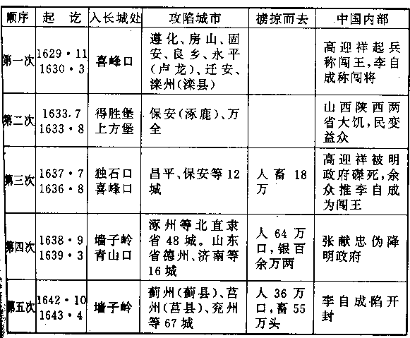 从上表可以看出,在腐败的明王朝政府手中的万国长城,已成为脆弱的篱笆,丧失了它所应具有的防御北方蛮族的功能。后金汗国在稍后也拥有葡萄牙巨炮,只要高兴,他们可以在任何地方轰出一个缺口,长驱直入。 最重要的一次入塞是第一次,由皇太极亲自率领,直抵北京城下,给骄傲自大的明政府带来最大的震恐。袁崇焕这时已擢升为辽东军区总司令(辽东督师),他得到消息,立刻统率五千骑兵向北京驰援,日夜不停的奔驰四百公里,到达北京时,人与马都疲惫不堪,但仍在广渠门(北京城门之一)外,击退后金兵团的攻势。可是北京那些勇于内斗的官员们并不感谢他,反而认为他应负不能阻挡敌人攻破长城的责任。而被攻陷的喜峰口(河北迁西北),却是属于另一个军区——蓟州军区。皇太极对这个屡次阻挠后金军事行动兼杀父之仇的袁崇焕,尤其恨入骨髓。一个小说上虚构的反间谍故事,移上真实的政治舞台。熟读《三国演义》的皇太极,运用“周瑜计赚蒋干”的方法,实施他的阴谋。 这个阴谋中扮演蒋干角色的是两个被俘虏的明王朝宦官,他们在睡梦中隐约听到看守他们的后金卫士如下的耳语对话。一个问:“今天怎么忽然停战?”一个答:“我看见可汗骑马走向敌人阵地,有两个人迎上来相见,密谈了很久。大概袁崇焕有什么秘密信息,事情很快就会解决。”两个宦官不久就自以为很幸运的逃出牢笼,回到北京,向第十七任皇帝朱由检告发。不但朱由检大大的震怒,几乎所有的官员都额手称庆叛徒的奸谋败露,使北京得免陷落。袁崇焕被捕,在舆论沸腾中,受到磔刑处死。 过了十六年,后金汗国(那时已改称清帝国)攻占北京,公布这场公案的内幕,用以炫耀自己的聪明,嘲笑明王朝官员愚蠢如猪。 袁崇焕冤狱,为后金汗国铲除了一个最大的劲敌,但皇太极仍继续追求和解。他发现汉民族对“金”这个国名,和“女真”这个族名,有一种无法泯灭的憎恨感情,阻碍两国接近。而“可汗”也只是部落总酋长的称谓。于是,就在一六三六年,第一次入塞撤退后,采取一项重大而激烈的改变:取消“金汗国”,改称“清帝国”;取消“女真”,改称“满洲”;取消“可汗”,改称“皇帝”。并且进一步取消自己原来的中国姓氏“佟”,改姓女真姓氏“爱新觉罗””,彻底泯灭“建州女真”和“建州卫”臣属过中国的那一段历史。杜撰满洲人的起源,宣称是三位仙女中的一位仙女的后裔。 为什么改称满洲?历史学家有很多解释,我们认为可能为了纪念建州卫的创立人,他们伟大的英雄祖先李满住。“满洲”“满住”,声音相似。这不是没有前例的,四世纪大分裂时代吐谷浑汗国,就是用他们祖先慕容吐谷浑的名字,作为部落和汗国的名字。自此次改称之后,清帝国对“金”、“女真”、”可汗”,无论在文件上或书籍上,全部一笔勾销,好像地球上根本没有这回事一样。当然他们无法没有遗漏,所以我们才知道。 不过,和解仍不能达成。明政府要求清政府去掉皇帝的尊号,改称国王,作为像朝鲜一样的藩属。清政府则要求两国的地位平等,而且还要把长城以北的三个据点割让。双方事实上都无法接受对方的条件。明政府更有一个心理上的困难,那就是清政府那一撮人在理论上显然是一群叛徒,要是公开承认它的合法而又尊严的地位,有违儒家的“汉贼不并立”的正统思想。而且自从十二世纪秦桧诬杀名将岳飞,跟金帝国和解,因而招致唾弃以来,中国人对于和解有一种罪恶的印象,认为凡是主张作战的都是民族英雄,凡是主张和解的都是投降屈服的卖国贼——即秦桧系统的认贼作父的汉奸,连皇帝都不敢公然触犯这些禁忌。一六三八年,明王朝已残破不堪,清军作第四次入塞时,河南军区司令官(河南四川军务总理)卢象升,率军增援北京。朱由检问他的意见,希望听到主和的建议,但卢象升正色说:“我主战。”朱由检只好默不作声。卢象升是一个主战派的典型,不惜牺牲自己的生命,事实上他就在这一战役阵亡。但他的政治见解——明明战不胜而偏要战,却严重的伤害了他所效忠的国家和政府。 皇太极终于把明王朝的锦州、松山先后夺取,并且在松山生擒了明军总司令(蓟辽总督)洪承畴。山海关外,只剩下宁远(辽宁兴城)一个据点。朱由检命国防部长(兵部尚书)陈新甲加速跟清政府接触,经过无数次往返,已进入可行的阶段。可是陈新甲粗心大意,竟把这种极机密的文件,随便放到桌子上,被他的助手当作可以公开的普通文件,刊入政府公报(邸抄),于是,立即引起空前庞大的政治风暴,全体官员誓言跟通敌卖国的汉奸不共戴天。朱由检不敢承认这是他的主意,而且也痛恨陈新甲不能保密,陈新甲遂被处斩,和谈也跟着停止。 依当时的情况,和解是使明王朝得救的唯一机会。如果能像十一世纪宋帝国跟辽帝国那样和解成功,明王朝即可减轻人民的赋税,再把抗清的部队投入内战战场,它可能不致覆亡,至少可能使覆亡后延。 现在,和解的主持人被杀,皇太极由失望而愤怒。他再作第五次入塞,明政府已无丝毫力量阻挡。 自一六一六年努尔哈赤建立后金汗国,到一六四四年他的孙儿攻进北京,二十八年间,明政府不但不能发愤振作。反而更加速溃烂。 第十四任皇帝朱诩钧的断头政治,继续如故,但他总算在萨尔浒战役的次年(一六二○)逝世。他死后,三十四岁的儿子朱常洛即位,在位只三十天,一病而死,十六岁的儿子朱由校继位。