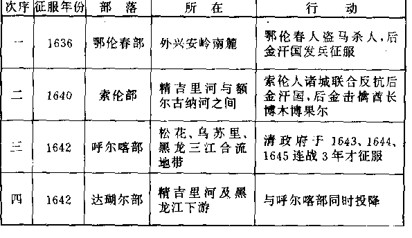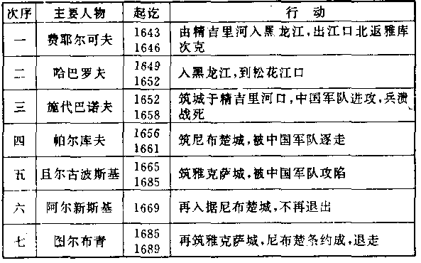 满洲人蓦然间被请进山海关时,他们在东北所征服的土地已达三百万平方公里。满洲人作为中国的主人后,这片广漠的土地,就成了他们嫁妆的一部分。 比满洲人向北拓展稍早,俄罗斯帝国远在欧洲的斯拉夫人,已越过乌拉尔山脉向东扩张,西伯利亚荒原上人数稀少的原始游牧部落,不是那些俄国人的对手。从本世纪(十七)初叶到六十年代,俄国人在荒原上建立起来一系列的殖民城市,最主要的有下列诸城: 一六○四年 牧木斯克(明王朝皇帝朱诩钧在位) 一六一九年 叶尼塞斯克(萨尔浒战役之年) 一六三二年 雅库次克(后金第二次入塞前一年) 一六三八年 鄂霍次克(后金第四次入塞之年》 一六五八年 尼布楚(郑成功北伐图南京前一年) 一六六六年 塞楞金斯克(三藩战役前七年) 雅库次克显然是俄国向东向南侵略的主要据点之一,它距黑龙江约一千二百公里。俄国的冒险家、流氓、杀人凶手、亡命之徒,当然也有抱着为国家开疆拓土高贵目的的英雄志士,从本世纪(十七)四十年代起,不断向温暖的东南方和南方发展,窥探井勘查当时刚刚被后金汗国征服不久的黑龙江流域。后金汗国于一六四二年吞并了呼尔喀、达瑚尔部落,明年(一六四三),俄国第一批探险队从雅库次克出发,相差不过一年,但这一年已够确定中国在法理上对于黑龙江南北两岸广大地区的主权。 俄国人出动的次数和乘隙深入后金汗国——中国国境的情形,我们借下表说明: 俄国人的运气不好,不仅是脚步迟了一年,而且它遇到的不是明政府奄奄一息腐烂透了的弱小中国,而是清政府正走上坡,朝气蓬勃的强大中国。俄国第一批和第二批行动队不过穿过中国东北的荒原地带,没有被清政府发觉,但是第三批行动队在施代巴诺夫领导下,在精吉里河口建筑城堡,兴高采烈地打算长期占领时,正式跟中国的力量接触。中国宁古塔(黑龙江宁安)军区参谋长(宁古塔章京)沙尔呼这,率领四十五艘军舰,逆黑龙江而上,给他代巴诺夫迎头痛占,施代巴诺夫全军覆没,他自己也于稍后被杀。俄国的侵略当然不会因这小挫折而停止,第四批在外蒙古之北建筑尼市楚城,但被中国逐走。但俄国人不久就又回来,中国人未加过问。第五批在黑龙江北岸,建筑雅克萨城要塞和卫星城堡,这批凶恶的俄国民徒把当地土著索伦人当作奴隶,奸淫妇女,并抢劫他们的辛苦猎取的貂皮。索伦人报告中国官吊,但当时清政府正困于三藩的战争,没有力量北顾。