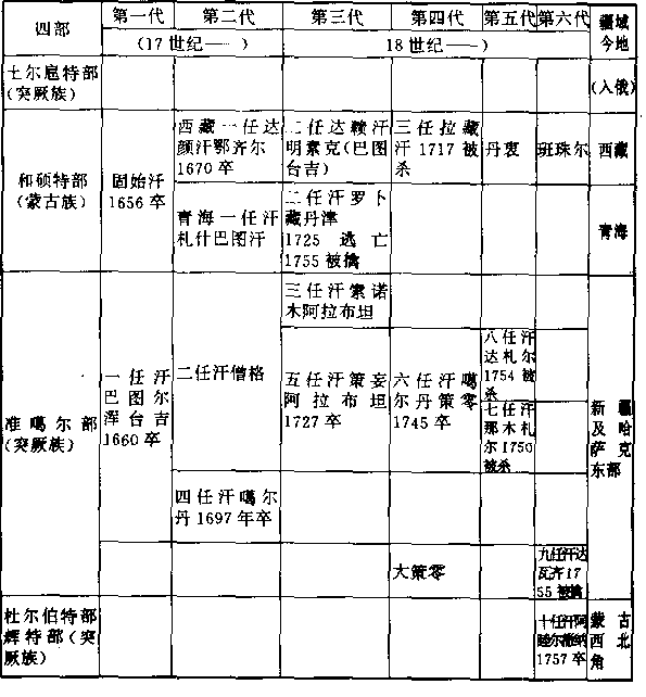 盟旗制度完全仿效满洲人的八旗制度,满族八旗:正黄旗、正白旗、正红旗、正蓝旗、镶黄旗、镶白旗、镶红旗、镶蓝旗(镶旗是:黄白蓝三旗镶红边,红旗镶白边)。这是努尔哈赤创立的图腾结构,所以满洲人没有地的籍贯,只有旗的籍贯,是一种全民皆兵的新户籍制度,全体满洲人是一个大奴隶集团,被划分为八份,人民受到层层节制,不能离旗独立。自入关后,原意渐失,演变成为一种单纯的军事制度。但同类型的蒙占盟旗制度,却一直保存到二十世纪,仍然存在。盟旗制度的特点就是八旗制度的特点,蒙古人被纳入组织后,局限在一块狭小的地区,不能选择居住地和牧场。旗跟旗之间也不能有横的来往,连流动于各盟旗间的小贩,都严厉禁止,目的当然是防止他们暗通消息,集结叛变。“逐水草而居”的时代从此消失,即今遇到荒旱,非清政府批准,不能移动。 其二 对蒙古人实行愚民政策,阻止他们接受汉民族文化。清政府统治蒙古,有两个秘密武器,一是利用喇嘛教,使蒙古人沉湎在宗教里面,不知不觉中丧失战斗精神,这方面的效果是可惊的。另一是把公主大批的嫁给蒙古酋长——他们本来称可汗,投降满洲人之后,被改封为藩王或公爵,合称为“王公”。满洲人的皇姑、皇妹、皇女之流,大多数都嫁给蒙古王公,从没有一个嫁给汉人的。清政府的政策是,用科举控制汉人,用婚姻控制蒙古人,结果证明完全成功。公主的儿子自幼随着母亲在外祖父或舅父的皇宫中游戏,长大后自然有一种向心力。纪元前二世纪大政治家娄敬,向当时的皇帝刘邦建议的和亲政策可收的效果,现在完全应验。本世纪(十七)九十年代,玄烨大帝在多伦诺尔(内蒙古多伦)用盛大的宴席招待蒙古高阶层时,发现很多蒙古王公都是他的外甥或外孙,又几乎都是在北京皇宫里长大的,不禁大为得意。但清政府虽赐给这些王公们财富和荣耀,巩固他们对人民的统治尊严,却对他们仍深谋远虑地细心防范,不准他们跟汉人来往,不准学习汉文,不准保管汉文图书,不准请汉人担任教师,不准子弟进入汉人学校,不准看汉人的戏剧。目的使蒙古人永远愚昧无知。从此,面积约一百万平方公里的内蒙古,自本世纪(十七)起,也作了满洲人嫁妆的一部分,带到中国,永远成为中国的领土。 比内蒙古还要庞大的外蒙古,在喀尔喀部统治之下,仍独立于瀚海沙漠群之北。已迁到北京的清政府无意向北发展,他们对拥有内蒙古广大的领土和西伯利亚外兴安岭以南广大的领土,已心满意足。可是一个意外的事件,却使外蒙古自动地请求跟中国合并。这个事件起因于以伊犁(新疆伊宁)为首都的准噶尔汗国,于《尼布楚条约》签订的前一年(一六八八),向外蒙古喀尔喀部发动攻击。 喀尔喀是蒙古请部落中,人口最少,但占地却最广的一个部落,又分为下列三个汗部: 一 车臣汗部(外蒙古东部,牙帐设今温都尔汗) 二 土谢图汗部(外蒙古中部,牙帐设今哈尔和林) 三 札萨克图汗部(外蒙古西部,牙帐设今贝格尔) 所谓喀尔喀部,只是一个部落的总名称,不是一个具体的行政组织,更没有一个共同领袖。事实上三个汗部独立并存,各有各的可汗,互相间不停地打斗。 准噶尔汗国是四卫拉特之一准噶尔部建立的国家,参考上上世纪(十五)第四节附表及第六节,我们会记起当时声势煊赫,生擒过中国酒肉皇帝朱祁镇的瓦拉部落。瓦拉自从也先可汗死后,失去领导中心,这个突厥民族的部落分裂为三部:土尔扈特部、准噶尔部、杜尔伯特部——稍后被辉特部取而代之,他们向西迁移到现在的新疆北部。而另一支蒙古人的和硕特部,也侵入到新疆北部,跟他们混合。于是,遂被笼统的称为四卫拉特。卫拉特,即瓦拉的转音。 本世纪(十七)二十年代,和硕特部在固始汗率领下,侵入现在的青海省,建立一个庞大的和硕特汗国。土尔扈特部也移向中亚,深入欧洲。新疆北部的故土上,只剩下准噶尔部跟辉特部。我们用下表列出这四个卫拉特可汗的世系: