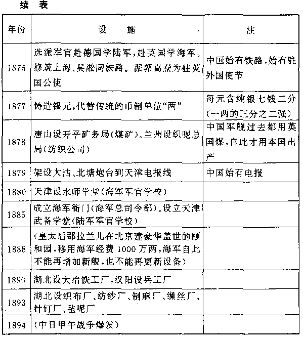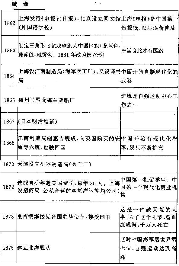 自强运动最重要的是设立总理各国事务衙门,它是英法联军打进首都北京后的新生事物。过去各国只能跟清政府指定的边疆地方官员交涉,像俄国只能跟库伦(蒙古乌兰巴托)的办事大臣,欧美各国只能跟广州的两广总督交涉。清王朝中央政府只有一个藩属事务部(理藩院),处理藩属国的事务。即令在鸦片战争之后,仍然如此,所以英法修约之议初起时,两广总督叶名琛拒不见面,英法连谈话的对象都找不到,才决定改用武力。 总理各国事务衙门的设立,表示清政府终于在心理上承认世界上尚有平等地位的国家。它等于现代的外交部,但外交不过是总理各国事务衙门的主要工作之一,事实上它是自强运动总司令部,奕訢是最高统帅,稍后出任北洋通商大臣兼直隶(河北省)总督的李鸿章,则是总执行官。总理各国事务衙门负责推动的几乎是包罗万象的各种前所未闻的崭新业务,诸如: 一 教育自强运动需要通晓外国语文的人才,同文馆(外国语学校)不仅培植语文人才,除了英文、法文、俄文、德文四个学系外,同时还培植科学人才,有天文系、化学系、地质学系、格致系(物理学系)、医学系,是近代国立大学的雏型。 二 海关这本应是财政部(户部)的事,现在由总理各国事务衙门主持,聘请英国人当海关的首长,称“总税务司”。沿海沿江口岸和沿边商埠,所有对外贸易的税收,留下十分之三作自强运动的经费,其他十分之七缴入国库。 三 海陆军总理各国事务衙门又是海军部兼陆军部。海军舰队、船只、军港,和海军附属单位,如军械局、造船厂、海军军官学校,全由总理各国事务衙门负责。陆军军官学校、炮台要塞,新的陆军训练,以及海陆两军一切向外购买武器事务,也都归总理各国事务衙门,当时的国防部(兵部)几乎成了一个不重要的机构。 四 其他不仅仅上述的那些而已,其他像矿产开发、铁路、电线、轮船、国内和海外航线、工业工厂之类,凡是跟船坚炮利有关的,甚至虽然无关,但只要跟外国有关,就都由总理各国事务衙门主持。 因为自强运动主要的形态是军事的西洋化,和跟东西洋各国的洋人打交道,所以也被称为“洋务”。大量金钱投下来,中国不久就在外貌上呈现出一种金碧辉煌的场面,新式海军阵营堂皇,战斗力强大的北洋舰队最先成立,另外还有三支比较小的舰队,即南洋舰队、粤洋舰队和1884年在闽江口被法国全部击沉的闽洋舰队,拥有号称世界第七位海权大国的巨舰巨炮,本世纪(十九)七十年代之后,中国在世界上虽已不是超级强国,但仍保持一等强国的尊严。 然而,政治腐败和官员的贪污无能,使新建立起来金碧辉煌的军事力量,不过是一副漂亮的拳击手套。被击败的末期癌症的老拳师,在观察强大对手的优点时,不归功于对手的强壮如牛,反而归功于对手有一副漂亮的拳击手套——比湖南兵团司令官杨芳归功于对手有妖法,已是很大的进步了。老拳师认为只要他也有这么一副漂亮的手套,就可发生同等的威力,甚至更大的威力,因为自己的身体(政治的和社会的)比对手健康得多。清政府的自强运动目的就是要弄那么一副漂亮的拳击手套,现在他们已经弄到。 只有少数人发现问题并不这么简单,其中一位就是驻英公使郭嵩焘,这位科举出身的官员,却有时代的见解,他在英国写信给李鸿章,警告说: 西洋立国两千年,政治和教育,都非常修明。跟辽金崛起的情形,绝不相同。……西洋富强,固不超过矿业、轮船、火车。但它们所以富强,自有原因。……我们必须风俗敦厚,人民家给户足,作为基石,然后才可以谈到富强。岂有人民穷困不堪,而国家能富强之理。现在谈富强的人,把国家大事,看作跟人民无关。官员贪污,盗贼横行,水灾旱灾不断,上下交困,每天都在忧患祸乱。这时轻率的追求富强,只不过浪费金钱。……船坚炮利(“兵事”)是最末微的小事,政治制度才是立国的根本。……中国之大患,在于士大夫没有见识。 总理各国事务衙门曾把郭嵩焘的各种报告,汇集出版,我们所引的不过其中一小片断,但可看出他的真知灼见。然而,他的真知灼见不但不能在当时引起正面反应,反而被全国沸腾的士大夫阶层的卫道舆论,痛诋他是数典忘祖的汉奸卖国贼。 一八九四年,中日甲午战争爆发,清政府戴上这副漂亮的拳击手套出场。 第七、第八世纪二百年间,中国文化大量输入日本,使日本跟在朝鲜之后,成为世界上采用中国文字为本国文字的两个国家。十三世纪时,中国跟日本同时受到蒙古帝国的侵略,中国被蒙古人建立的元帝国政府统治,而日本靠台风的帮助,幸免于难。 十七世纪一六三五年,日本征夷大将军(江户幕府)德川家光下令驱逐所有的外国人,禁止日本人出国,在国外的日本人也不准返回日本,只允许中国和荷兰少数商船到长崎贸易。这是著名的锁国令,日本像一个塞着瓶口的瓶子,跟外界隔绝。 日本锁国二百一十九年,本世纪(十九)一八五三年,即太平天国定都天京(江苏南京)的那一年,美国海军的一个舰队。在舰队司令培理的率领下,来中国保护美国侨民。在航行中途,不知道什么原因,突然闯进日本的东京湾(江户湾),要求日本同意通商,培理送两幅白旗给日本官员,告诉他们作为战败时投降之用,又告诉他们说,今年不能久留,明年当再度来此。日本全国在惊恐中等到了明年(一八五四),培理果然如约光临,日本没有抵抗就告屈服,跟美国签订《神奈川条约》,锁国时代结束,门户大开