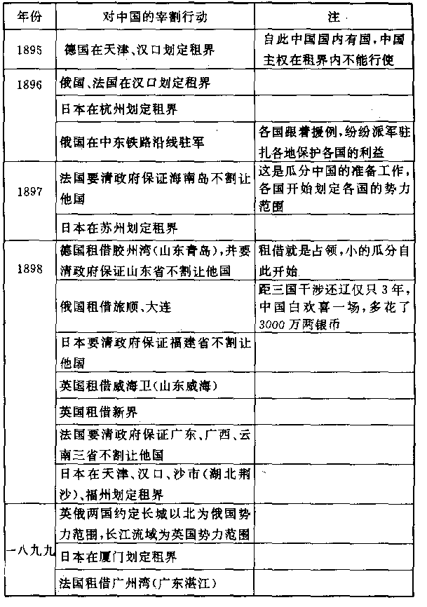从上表可以看出,中国已千疮百孔,支离破碎,开始受到各国的凌迟酷刑。过去他们对中国还保持着对待一个一级强国应有的礼貌,现在完全露出帝国主义的狰狞嘴脸,不再作任何化装。像俄国对旅顺、大连,它的舰队突然闯进港口,声称有租借它,的必要,就大模大样作军事占领,清政府只好答应。英国对威海卫,法国对广州湾,都是直率地提出他们的要求。中国清政府这个末期癌症的老拳师,在失去了漂亮的拳击手套之后,只有挨打的份。 各国的势力范围也就是各国预定的瓜分地区,都已协调妥当,只等动手的信号。幸而这个信号没有出现,却出现了美国的敏锐反应,美国不愿意被排除在瓜分的行列之外。本世纪(十九)最后一年(1899),美国国务卿(外交部长)约翰开发表声明,强调维护中国领土的完整和政治的独立,以及各国在中国有均等的通商贸易机会。这就是著名的“对华门户开放宣言”,各国因为它可以消除各国在中国对抗的紧张形势,先后表示赞成。 中国就在这种脆弱的均势之下,苟延残喘。 但被瓜分的危机,已使广大的青年知识分子觉醒。 《马关条约》签订的那一年(一八九五),北京正在举行科学制度下的全国考试,集中在北京参加考试,来自全国各省的数千名考生(举人),悲愤交集,推举一位广东省的考生康有为当领袖,领导大家向皇帝载湉上书,要求效法日本的明治天皇,变法维新。专制政府等级森严,这份请愿书当然到不了载湉面前。次年(一八九六),康有为已考取了进士,再向载湉上书,载湉仍然不会看到。不过以康有为当领袖被称为维新党的知识分子们的呐喊,已掀起政治性的狂飙,成为十二世纪宋王朝大学生在被金军包围的首都开封,发动激烈的知识青年救亡运动以来,第二次激烈的知识青年救亡运动。自强运动是当权官员发动的武器改良,现在是青年们要求发动的政治改革。 经过皇家教师副宰相兼财政部长(协办大学士户部尚书)翁同和的推荐(在康有为失败后。翁同和又誓言他没有推荐过),年轻的皇帝载湉,发现了这个救亡运动。他在读到康有为稍后所著的《波兰亡国记》、《突厥亡国记》,不禁痛哭流涕,这位头脑清晰的君主对他的王朝和中国的前途,怀着极大的忧虑。本世纪(十九)最后第二年(一八九八),古历的戊戌年,二十九岁的载湉,接见地位卑微的康有为。接着从四月二十三日起到八月五日,一百零三天中,载湉颁发了下列一连串严厉的诏令,实行公孙鞅式的变法: 一 科学考试仍保留,但废除八股文,改用议论体裁。 二 设立北京大学(京师大学堂),各省原有的旧式书院(专门研究儒家的四书五经,造就科举考试人才),一律改为现代化的中学小学。并创办茶丝专科职业学校。 三 命满洲兵团,全部改用现代化武器,用新式训练。并将汉人组成的绿营兵团,改为警察。 四 撤销叠床架屋的若干中央机构,如詹事府(皇太子宫事务部),通政司(皇宫文件奏章收受处),光禄寺(皇宫供应部),鸿胪寺(属国或外国使节招待部,职权跟理藩院——藩属事条部重复),太常寺(祭祀部),太仆寺(畜牧部),大理寺(最高法院,职权跟刑部——司法部重复)。 五 选派满洲贵族出国游历考察。 六 改良司法部门,改良刑事诉讼法,改革监狱弊端。 七 命各省出版农业丛书,奖励各种工商发明。 除此之外,康有为还建议载湉进行更激烈的下列明治维新式的改革: 一 建立内阁会议制度,由皇帝召见大臣讨论国事(开懋勤殿)。 二 禁止妇女缠足。 三 请载湉率先剪去辫子,改穿西服(断发易服)。 四 请迁都上海,摆脱旧势力,在新环境中改革。 五 借巨款六亿元,改良军队,广筑铁路。 一百零三天中,载湉所作的这些冲击,使全国那些朽烂透顶了的官员士大夫阶层,像被挑了巢的蚂蚁一样,惊恐失措,骇叫奔走,乱成一团。自从十一世纪王安石变法失败以来,中国历史即显示出一个定律,在士大夫政治形态下,任何变法和改革都不可能。以王安石无懈可击的道德声望,和崇高的宰相地位,皇帝赵顼又有绝对控制政府的权力,都归于惨败。康有为不过一个新进的小官——工程部科长(工部主事),要他领导负载如此沉重的政府,做出比王安石还要激烈十倍的改变,失败自在意料之中。 变法运动在技术上也发生错误,包括载湉在内,维新党没有一个人有实际的政治经验,他们不先谋求广大人群的觉醒,反而在自己的力量还没有能控制局势之前,剥夺了太多人的既得利益,因而树立太多的政敌。像突然间废除八股文,仅此一项就使全国知识分子恨入骨髓,因为在这世界上,除了八股文外,他们再不会其他东西了,废除八股文就等于把他们全都埋葬。像突然间撤销那么多具有。千年历史的古老官署,立刻就触怒依靠那些官署为生的官员和寄生人物,他们散布在北京的大街小巷,制造出愤怒的舆论,看起来北京就像是沸腾了一样。没有做好准备工作而作太猛烈的刹车,会导致车辆翻覆。没有做好准备工作而作太猛烈的改革,会引起暴力对抗。 守旧党的势力事实上比维新党强大百倍以上,儒家学派理学巨头宰相徐桐,就是代表人物之一,他连从洋楼前面走过都不肯,他坚持“宁可亡国,不可改革”。监察部委员(御史)文祥是满洲人,他向载湉警告说,维新党的目的只在救中国,不在救清王朝。文祥的见解供给满族人反对改革的理论根据,他们誓言:“宁把国家送给友邦,也不交给家奴。”家奴,指的是汉人。 皇帝在理论上有绝对的最高权力,但必须获得军