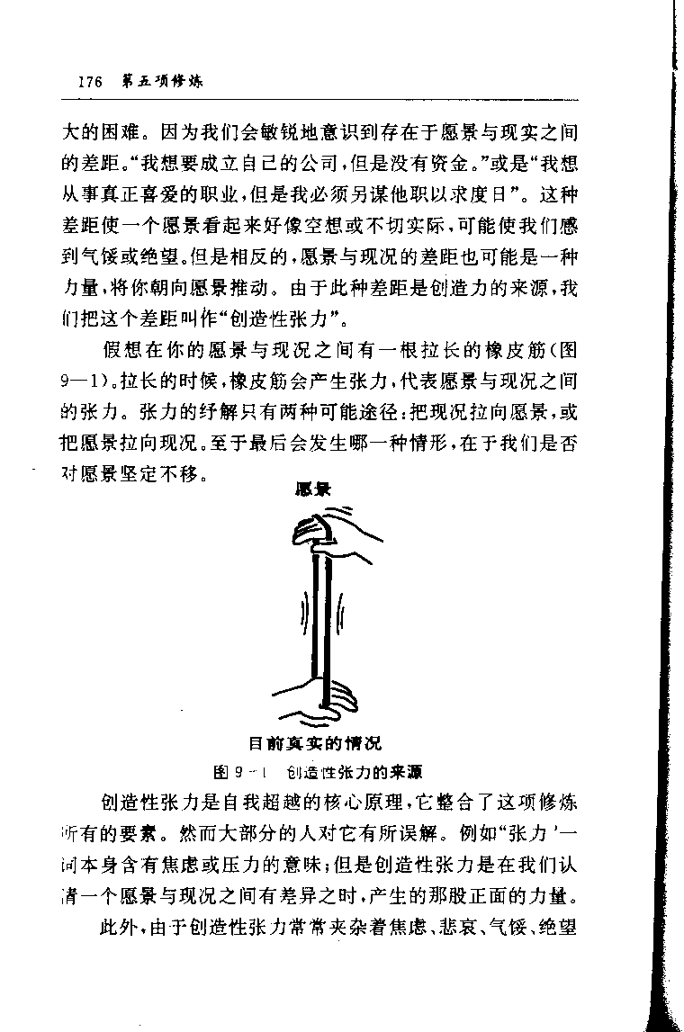 当我们握住一个不同于现况的“愿景”,就有一个差距存在吨糙性张力),这个差距能够以两种方式加以消除。位于下方的调节环路代表根本解:采取行动把现况拉向愿景。但是改变现况需要时间,这导致位于上方的环在调节的过程中会产生挫折与情绪张力,症状解于是降低“愿景”而把它拉向现实。 但是降低一次愿景还不是故事的结局。当愿景不易达到,进一步降低它的压力依然存在。典型的“舍本逐末”结构于焉形成。一个潜藏的“未能达成目标一挫折一降低愿景十暂时纤解压力”增强螺旋,使愿景进一步降低。于是渐渐的,愈来愈以降低愿景的“症状解”方式来解决问题。 神奇科技与人民航空解除情绪张力的方式,是降低看起来似乎不可能达成的关键性作业标准,即降低交货绩效与服务品质的标准。因为是渐进的,标准的下降特别难以察觉。神奇科技的每一次危机中,交货标准只侵蚀了一点点。同样的,人民航空的管理者并不曾在某个早晨醒过来的时候声称:“我们将以降低服务标准的方法,跟上需求的成长。”而是在一再重演的危机和关键领导者的更替过程中,服务标准悄然受到侵蚀,因此,当我们逐渐放弃想要成就的工作、想要拥有的家庭生活,或想要居住的世界,个人“愿景”便在不知不觉中受到侵蚀。 在组织中,常因对情绪张力的容忍不够,而让目标受到侵蚀。没有人愿意担任传达坏消息的信差。最容易的方法是装假没有坏消息,或干脆声称胜利;只要降低判断所依据的标准,把坏消息重新定义为没有那么坏就可以了。降低情绪张力的环路存在于人类活动的所有层次。它们是妥协的由来、是造成放弃真正理想的根源。如英国作家毛姆所言:“只有平庸的人才总是处于自己最满意的状态。” 当不愿意与情绪张力相处的时候,我们容许目标被侵蚀。相反的,如果我们了解创造性张力,它将不但不会降低愿景,反而使愿景变成行动的力量。弗利慈指出:“愿景是什么并不重要,重要的是愿景能够发挥什么作用。”真正有创造力的人,使用愿景与现况之间的差距来产生创造的能量。实现愿景的动能 举例而言,全录公司位干帕罗奥图的研究中心(Xerox Palo Alto Research Center,简称PARC)是许多个人电脑关键功能的发源地,该中心的研究负责人凯伊(Alan Kay)有一个“愿景”,就是想要推出一种交谈式的电脑——dynabook。他的理想是小孩子也能够用它来测试理解力、玩游戏,和重组传统课本中的静态资讯,以培养创造力。在某种意义上凯伊是失败了,因为这种交谈式的电脑从未实现。但是这个“愿景”改造了电脑产业。在这个研究中心开发的电脑雏型所创造的一些功能,如视窗、下拉式目录、滑鼠控制、图像显示等,10年之后被麦金塔(Macintosh)电脑系列产品实现了。 美国波士顿赛尔提克(Celtics)篮球队的传奇灵魂人物罗素(Bill Russell),有保留自己评分卡的习惯。他在打完每一场球之后,用一张满分为100分的评分表为自己评分。在他的篮球生涯中,他从来没有得过65分以上。现在,依我们多数人以目标为终点的思考方式,我们会将他看作落魄的失败者,我们会说:“可怜的罗素,打了1200多场的球赛,从来没有达到过自己的标准!”然而,就因为他拼命要达到自己的标准,他成了最杰出的篮球员。 这印证了前面所说的:愿景是什么并不重要,重要的是愿景能够发挥什么作用。 创造性张力可转变一个人对失败的看法。失败不过是做得还不够好,是愿景与现况之间存在的差距。失败是一个学习的机会,可看清对现况的不正确认知、体察策略为何不如预期有效,和检祝愿景是否明晰正确。拍立得的创立及发明者,并担任十数年经理的兰德(Ed Land),在他的墙上有这么一句警语:“每一项错误都是一个累积最后成果的事件。” 创造性张力能培养毅力与耐性。一位日本主管在我们的讲习会上告诉我,日本人与美国人对时间的看法相当不同。他说;“美国商人在与日本人交涉业务时,常发现日本人并不立即开始谈业务。美国人按照紧凑、细心规划的5天工作进度表到了日本,急于立即开始工作。而日本人则安排优雅的品茗会向他们致意,老是不触及细节。过了一天又一天,日本人还是保持缓慢的步调,而美国人变得愈来愈心神不宁。”这位日本高级主管说:“对美国人而言,时间是敌人。对日本人而言,时间是盟友。”真实是盟友 对大多数人来说,现况本身是个敌人。创造性事物的拉力,比不上已存在现况的阻力。按照这样的逻辑,我们愈是厌恶现况,愈有改变的动力。换句话说,除非事情变得坏透了,否则大家不愿作任何根本的改变。 上面的说法使许多人误以为根本的改变,必须要到面临生存的威胁时才会产生。它是一个过度简化的陷阱。我常在研讨会上问:“有多少人相信危机会使人与组织产生根本的改变?”一般总有75—90%的人举手。然后我请他们假想身处于一种生活中的每件事都如意的状况:在个人生活、家庭、工作、社区上,绝对没有任何问题。接着我问:“如果你有一个完全没问题的生活,什么将是你首先想追求的?”绝大多数的回答都是:“改变或创造某种新的事物。”事实上人类比我们假设的更为复杂。我们既害怕改变又寻求改变。或如一位研究组织改变的专家所说的:“人们并不抗拒改变,他们是抗拒被改变。” 精熟创造性张力可使我们看待现况的心态产生根本的转变:真实的情况成了盟友而
