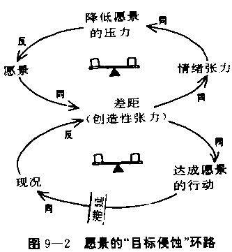 创造性张力是自我超越的核心原理,它整合了这项修炼听有的要素。然而大部分的人对它有所误解。例如“张力’一词本身含有焦虑或压力的意味;但是创造性张力是在我们认清一个愿景与现况之间有差异之时,产生的那股正面的力量。 此外,由于创造性张力常常夹杂着焦虑、悲哀、气馁、绝望或担忧等感觉;以致人们易于将创造性张力与这些情绪混淆,甚至以为创造的过程就是处于焦虑状态。因此很重要的是,了解因创造性张力而产生的负面情绪,并不是创造性张力本身,而是所谓的“情绪张力”(emotional tension)。情绪张力VS创造性张力 如果我们未能分清创造性张力与情绪张力的不同,便会因深感气馁而降低愿景:“算了,只得75分没什么好大惊小怪的,我以前也曾以80分风光过。” 或者,“我真的不在乎能否在独奏会上演出,无论如何我必须教音乐赚钱。”解除情绪张力的过程是不易察觉的,只要不坚持愿景,把它降低一点,创造性张力松些,就能够解除情绪张力。如此我们所不喜欢的那些负面的感觉消失了,但是目标也因此降至更接近现况。消除情绪张力并不难,所付出的惟一代价,是放弃真正想要的愿景。 在第七章与第八章中,情绪张力是侵蚀神奇科技与人民航空目标的肇因。创造性张力与情绪张力的互动是一种“目标侵蚀”的环路,如图9—2所示。
