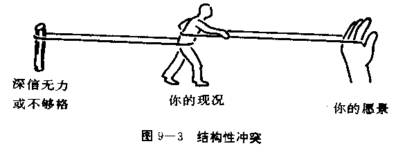 弗利慈使用一个隐喻,描述潜在矛盾如何发生结构性的作用,使我们与目标背道而驰(图9—3)。假想你向着自己的目标移动,有一根橡皮筋象征创造性张力,把你拉向想要去的方向,但是也想象还有第二根橡皮筋,被无力感或不够格的信念拉住。当第一根橡皮筋把你拉向目标,第二根橡皮筋把你拉回你不能(或不够格)得到这个目标的潜在想法。弗利慈称这种系统为“结构性冲突”(structural conflict),它是一个各方力量互相冲突的结构,同时把我们拉向和拉离所想要的。 因而,当我们愈是接近达成愿景时,第二根橡皮筋把我们拉离愿景的力量愈大。这个向后拉的力量可以许多方式呈现:我们开始询问自己是否真正想要这个愿景、感觉完成工作愈来愈困难、意外的障碍在我们的路途上突然冒出来,或者周遭的人也让我们失望。但是我们常不能察觉有结构性冲突的系统的存在。就是因为我们未能察觉,更增强了结构性冲突的力量。 当我们在寻求一个愿景时,如果有无力感或不够资格的想法产生,结构性冲突的力量就会开始活动,阻止我们迈向成功。然而成功的人是如何克服结构性冲突的力量,以竟全功呢?改变生命中的深层结构 弗利慈归纳出一般人对付“结构性冲突”力量常见的三种策略,然而每一种都有其缺失与限制。消极的让愿景被侵蚀,是其中常见的一种策略。其次是“操纵冲突”(conflict manipulation),也就是透过刻意制造的假性冲突张力,来“操纵”自己或他人更加努力,追求想要、或专注于除去、或避免我们所不想要的。操纵冲突是那些害怕失败的人所偏好的策略。此外,许多管理者非常擅长运用这种“如果我们的目标无法达成时,后果会如何”的方式来激励人们。不幸的是,绝大多数的社会运动者便是运用此策略,制造“负面愿景”来鼓励大众(譬如高喊反这个、反那个),而建立“共同愿望”。 但是或许有人问:“如果能够帮助我们达成目标,利用些许的忧虑或害怕又有什么错?”对寻求自我超越的人来说,这是一个简单的问题:“你真的想要一辈子生活在害怕失败的状况中吗?”可悲的是,人们一旦习于运用操纵冲突的方式,便会陷入“舍本逐末”的结构,相信只有透过连续的焦虑与害怕状态才能使自己成功。他们于是开始赞颂情绪张力,即使达成目标也没有喜悦,因为他们马上开始烦恼已经得到的会失去。 第三种常见的策略是“意志力”的运用,也就是全神贯注地去击败达成目标的过程中所有形式的抗拒力。多数高度成功的人具有过人的意志力,因而许多人把这项特性看作与成功同义:愿意付出任何代价,以击败阻力,达成目的。 但是意志力带来许多问题,这些问题可能一直为全心追求成功的人所忽视。首先,可能它所造就的是一种没有效率的成功;以系统思考的语言来说,也就是行动没有找到杠杆点。我们达成了自己的目标,但是耗费了巨大的心力与资源。而当我们成功的时候,会发现自己已精疲力竭,并怀疑这是否值得。讽刺的是,坚信意志力的人,事实上很可能会自己去找寻需要克服的障碍,或塑造必须除去的恶魔与必须征服的敌人,来显示神勇。此外,还有料想不到的后果。有些成功的人将这种使自己事业成功的意志力运用在家庭中,然而不但不管用,还破坏了婚姻及与子女的关系。(本书第十七章将更深入阐述这项想法。) 最糟的是,意志力的运用并未改变背后的结构性冲突,特别是潜在的无力感并没有真正去除。尽管有重大的成就,许多成功的人仍然觉得在他们生命中,有一种没有说出来的、深深的无力感,譬如个人及家庭不和谐关系,或是心灵的不安宁。 这些因应策略,在某种程度上是无法避免的。它们是一种根深蒂固的习性,无法在一夜之间改变。每一个人都有自己最习用的策略。接近我的朋友都知道,我长期以来最习用的就是意志力的策略。 然而能够解决结构性冲突的杠杆点到底在哪里?如果结构性冲突起于内心深藏的信念,那么只有从改变信念开始。但是心理学家一致同意,像是无力感或不够格这样的根本信念,无法轻易被改变。这些信念在人生的早期就开始发展。一旦我们仍抱持固有信念,则自我超越不易开展。矛盾的是,信念只有在自我超越的过程中,才会逐渐累积或改变。我们如何开始改变自己生命中较深层的结构呢? 四、诚实地面对真相 我们或许能用一项人们自古奉行的、简单却睿智的策略,作为处理“结构性冲突”的开始,那便是说真话。 人们通常不认为“诚实地面对真相”(commitment to the truth)是一个了不起的策略。“我要怎么做才能改变我的行为呢?”“我要怎样改变潜藏的信念呢?”人们常常想要有一个公式、技术或有形的东西,来解决结构性冲突。但当他们绞尽脑汁寻求解决之道时,却忽略了此一最有力的策略:诚实地面对真相。 诚实地面对真相不是指追求一项绝对的真理或追究万有之本源;而是根除看清真实状况的障碍,并不断对于自己心中隐含的假设加以挑战。也就是不断加深我们对事件背后结构的理解以及警觉。自我超越层次高的人,对于自己行为背后的结构性冲突,特别能够看得更清楚。 因而,处理结构性冲突的首要工作,在于辨认出这些冲突,以及它运作的模式。然而在我们使用这些策略的时候辨认它们又非常困难,尤其是其只伴随着焦虑和压力时。因此必须事前发展内部警告讯号。当我们发现自己为了某个问题在责怪某件