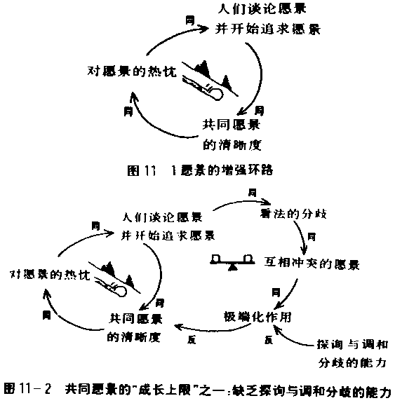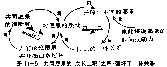 当汇集愿景所需时间及处理目前问题所需时间过多时,会相对的使可用于实现愿景的时间减少,而失去对于愿景的专注,也会使愿景在萌发阶段夭折。此时限制因素是专注于愿景的时间与精力不足,如图11—4所示。 这个结构的杠杆点在于能够找出方法,减少花在对抗危机与处理目前问题的时间和精力,或者是让追求愿景的人与负责处理目前问题的人各司其职。这种策略是由一小群人在组织的主要活动之外追求新构想;虽然这种方式往往是必要的,却难以避免形成两个完全无法支援的阵营。譬如,在八十年代初期,开发麦金塔电脑的小组,几乎与苹果电脑公司其余的人完全不相往来,后者大多数在发展较平凡的苹果二号电脑。虽然分开的结果产生一个突破性的产品——麦金塔,但是也造成组织内部的严重不和,使得苹果电脑的史考利耗费相当长的时间才消弥裂痕。破坏了一体关系 最后,如果大家忽略他们彼此连成一体的关系,愿景也会凋零。这也就是为什么愿景的追求必须透过共同探询的理由之一。一旦员工不再问“我们真正想要创造什么?”并在原本的愿景之外,产生另一种愿景时,往后继续进行的交谈品质,以及想要透过这项交谈提升的关系,都会受到侵蚀。在共同愿景背后最强烈的渴望之一,原本是来自希望连属于一个更大的目的、以及彼此连成一体的关系。但不得不注意的是,这样的连结需要时时悉心照应,否则它是非常脆弱的。只要我们对彼此的见解失去尊重,团体的凝聚力便会分崩离析,导致共同愿景的破灭。当发生此种现象时,团体成员便不再产生对愿景的真正热忱,如图11—5所示。