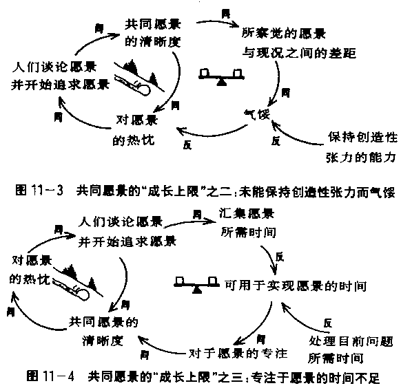 让我们参看图11—2,循顺时针方向解读这个抑制愿景的环路,从顶端:当热忱建立后,更多人谈论到愿景,看法的分歧性也因此提高,导致人们所表达的愿景互有冲突。如果不容许其他人表达不同的看法,则极端化作用增强,降低共同愿承的清晰度,并抑制热忱的升高 在成长上限的结构里,杠杆点通常在了解限制因素:找出造成限制过程的原因。在这个结构中,限制因素是探究不同愿景,以融会更深一层的共同愿景。如果组织无法发展出这种调和分歧的能力,个人愿景的分歧将逐渐扩大。 除去这个限制最重要的技巧,是在第十章“心智模式”中所介绍的“反思与探询”技巧。实际上,建立愿景的过程是一连串探询的过程,主要目的在廓清我们真正想要创造的未来;如果只是透过一个不断倡导与辩护而缺乏探询的过程,它至多只会产生遵从,决不是奉献。 然而透过探询的过程来扩散远景,并不意味着我必须放弃自己的观点。相反的,愿景需要强而有力的辩护者。但是辩护者也应以开放的态度探询他人的愿景,才有可能逐步将个人愿景,汇集而成更大的共同愿景,这就是全象摄术的原理。未能保持创造性张力而气馁 愿景的实现过程中,会遭遇到一些不易解决的困难,而使人们感到气馁,这也是造成愿景凋谢的原因之一。当人们愈能看清共同愿景的特性,愈能察觉愿景与目前现况之间的差距很大。人们可能会变得沮丧、不确定、甚至对愿景采取嘲讽的态度,因此造成热忱的衰退;“组织气馁”形成了另一个可能的“成长上限”,如图11—3所示。 在这个结构中,限制因素是组织内的人确实保持创造性张力的能力,这也是“自我超越”的中心原理;这也就是为什么我们一再强调“自我超越”是建立共同愿景的基石。不鼓励“自我超越”的组织,很难培养出对崇高的愿景经久不变的奉献。