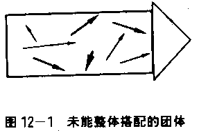波士顿赛尔提克篮球队的球员罗素(Bill Ruesell)曾经如此描写他们的球队:“就像其他专业领域一样,我们也是由一群专家组成的团体,我们的表现依靠个人的卓越以及团体的良好合作。我们都了解彼此有互相补足的必要,并努力设法使我们更有效地结合……。然而有趣的是,不在球场上时,按照社会的标准来看,我们多数是古怪的。绝不是那种能跟别人打成一片,或者刻意改变自己来迎合别人的人。” 罗素告诉我们,使他的球队打起球来与众不同的,不是友谊,而是一种团体关系。大伙儿在球场上的配合,使团体产生登峰造极的演出,那种高度的默契,难以用笔墨来形容,几乎像慢动作般的清楚,任何神奇的妙传或投射都可以发挥到不可思议的境界。 潜在的团体智慧 罗素所属的球队(在十三个球季中得过十一次NBA总冠军)呈现出一种我们称之为“整体搭配”(alignment)的现象,即一群人良好地发挥了整体运作的功能。然而在多数的团体里,成员各自朝向交错的目标努力。如果我们为这种团体画一幅图,看起来可能像是图12—l所示。