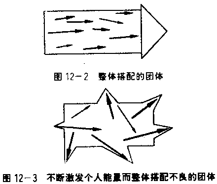 未能整体搭配的团体,许多个人的力量一定会被抵消浪费掉。个人可能格外努力,但是他们的努力未能有效地转化为团体的力量。当一个团体更能整体搭配时,就会汇聚出共同的方向(图12—2),调和个别力量,而使力量的抵消或浪费减至最小,发展出一种共鸣或综效,就像凝聚成束的雷射光,而非分散的灯泡光;它具有目的一致性及共同愿景,并且了解如何彼此截长补短。