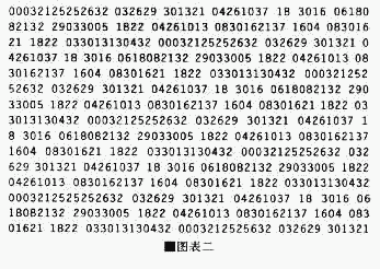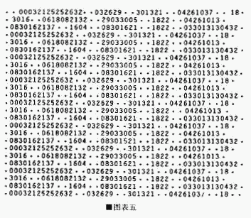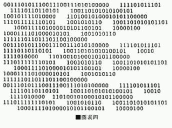 特德不耐烦地用指头敲击着控制台。 “这是很基本的,我亲爱的巴恩斯,”哈里说道,“这一部分其实很简单,困难的是——它所代表的意思。” “肯定是一条讯息。”特德说。 “也许是一条讯息,”哈里说道,“但也有可能是电脑内部释放出来的,是程式设计错误或硬件故障的结果。也许我们必须花上几个小时才能把它破译,而结果可能只是‘硅谷埃克米电脑公司版权所有’这类话。” “可是……”特德想插话。 “这些数列很可能是电脑内部产生的,”哈里说道。“不过还是让我来试试看。” 蒂娜把屏幕上的数字打印出来给了哈里。 “我也来试试。”特德迫不及待地说道。 “好的,菲尔丁博士。”蒂娜说着又打印了一份给特德。 “如果是一条讯息,”哈里说道,“那它很可能是一种简单的代码,就像电脑代码一样。如果我们在这台电脑上先运行一个解码程序,也许能得到一些帮助。有人会编制解码程序吗?” 大家摇摇头。“你行吗?”巴恩斯问道。 “不行,现在没有办法把这个东西传送到上面去了吧?华盛顿国家保密局的译码破密电脑15秒钟就能把它解出来。” 巴恩斯摇摇头。“没有办法。现在连用气球带一根无线电天线上去都做不到。最后一次气象预报时,他们说海面上有40英尺高的巨浪。天线一上去就会被冲断。” “这么说我们现在是与世隔绝了。” “是与世隔绝了。” “我想我们又要回到铅笔和纸的老方法上了。我总认为传统工具是最好的——尤其是在其他东西都不灵的时候。”哈里说罢离开了房问。 “看来他的心情不错。”巴恩斯说道。 “我认为非常好。”诺曼说道。 “也许好得过了头,”特德说道,“有点儿狂躁?” “不是,”诺曼说道,“心情很好。” “我看他有点太过兴奋。”特德说道。 “如果这种心情有助于他解释这些代码,那就不要去打扰他。”巴恩斯说道。 “我也来试着解解看。”特德说道。 “行啊,你也试试吧。”巴恩斯说道。 “我跟你说吧,像这样把宝押在哈里身上是不对的。”特德不断来回踱步,然后看着诺曼说:“哈里有点狂躁,而且他忽略了不少东西,很明显的东西。” “何以见得?” “比方说,这份打印件就不可能是电脑所释放的。” “你怎么知道?”诺曼问道。 “这台电脑的中央处理器,”特德说道,“是68090型,也就是说任何内存记忆转储都是16进制的。” “什么是16进制?” “表示数字有许多方法,”特德说道,“68090型芯片使用的是基-16表示法,即所谓“16进制”。16进制和普通的10进制截然不同,而且一看就能看出来。” “可是这上面使用的数字是从0到9。”诺曼说道。 “我正要讲这个问题,”特德说道,“所以它并非出自这台电脑内部。我认为这肯定是来自那个大球的讯息。此外,虽然哈里认为这是一种代码,但我认为这是一种直接的图像表示。” “你是说一幅图画?” “是的,”特德说道,“我觉得它代表的就是那个生灵本身!”他开始在一张张文件中寻找。“我从这张开始吧。”(参照图表四)