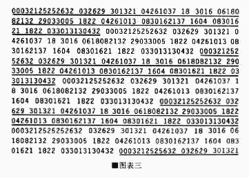 “你觉得是什么,哈里?”巴恩斯指着屏幕问道。 “你们以前看到的是不是也如此?”哈里问道。 “样子像,但是间隔位置不一样。” “这肯定是非随机的,”哈里说道,“它是一种单数列的不断重复。你看,从这儿开始到这儿,然后又重复。”(参照图表三) “他说得对。”蒂娜说道。 “真不可思议,”巴恩斯说道,“真是神奇,你竟能看出这个名堂。”