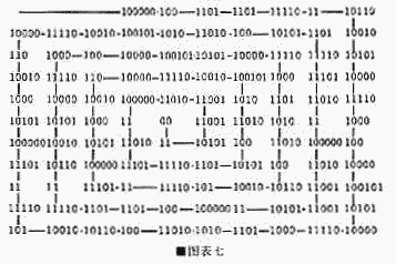 “它?” “也许它对埃德蒙兹的事表示遗憾。”哈里说道。 “你为什么这么说?”诺曼好奇地看着哈里。 “因为它显然是想与我们联络,”哈里说道,“它以不同的方式进行尝试。” “它是谁?” “它嘛,”哈里说道,“也许什么都不是。” 屏幕上出现一片空白,接着就出现了这样的图案。(参照图表九) “好,”哈里说道,“这很好。” “这是从哪儿来的?” “显然是从太空船上来的。” “可是我们跟太空船并没有电缆相连。它是怎么把我们的电脑打开,又把这个打印出来的呢?”