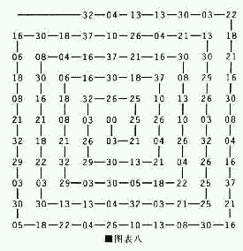 诺曼看着屏幕,大感不解。 可是哈里却高兴得直鼓掌。“太好了,”哈里说道,“这个东西非常有用。” “是吗?” “那还用说?现在我有了一个可以大显身手的机会。” “你是说破译这些代码?” “那当然。” “为什么?” “还记得原先的数字序列吗?这个序列属于同一类型。” “是吗?” “当然了,”哈里说道,“只不过这是二进制的。” “二进制,”特德边说边用手肘碰了碰诺曼,“我跟你说过二进制的重要性吧?” “重要的是,”哈里说道,“这可以验证我们从原先序列中对各个字母的破译。” “这儿有一份原先那个序列的打印件。”蒂娜说着送了一份给他们。 00032125252632 032629 301321 04261037 18 3016 06180821 32 29033005 1822 04261013 0830162137 1604 08301621 182 2 033013130432 “好,”哈里说道,“现在你马上就可以明白我的问题了。你看这儿:0-0-0-3-2-1等数字。问题是,我怎样把它译为字母。我当时还无法确定,现在可以了。” “怎么译呢?” “这个嘛,很明显,应该是3,21,25,25等等。” 诺曼像在听天书,一窍不通。“可是你是怎么知道的呢?” “你看嘛,”哈里不耐烦地说,“很简单,这是一个螺旋,从里向外读。它给我的数字的方式是—一” 突然,屏幕上又发生了变化。(参照图表八) “看,清楚了吗?” 诺曼皱起眉头。 “看,完全一样,”哈里说道,“明白了吗?从中心向外?0-0-0-3-21-25-25……它造成了一个从中心向外的螺旋。”